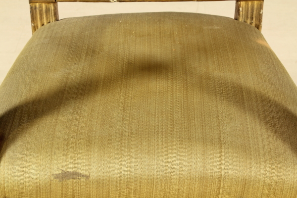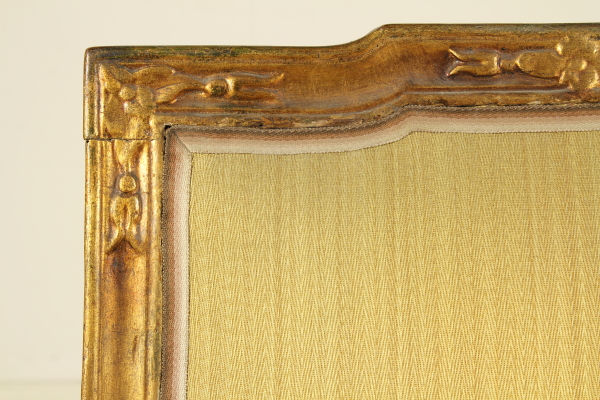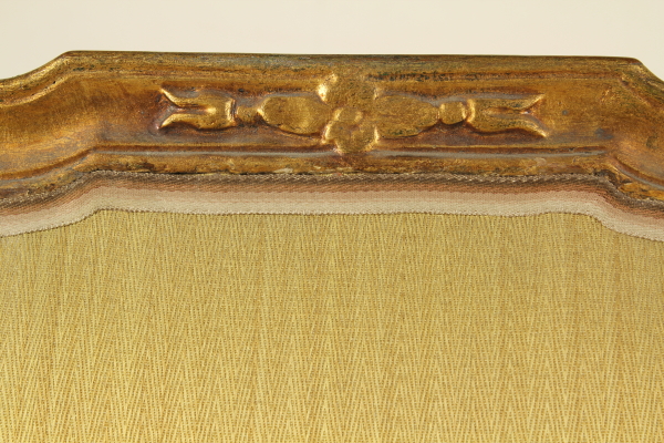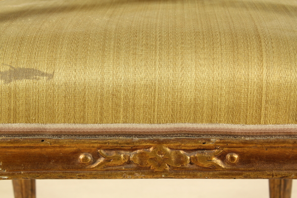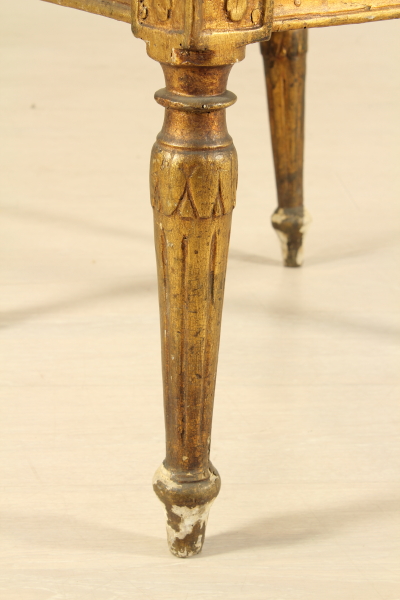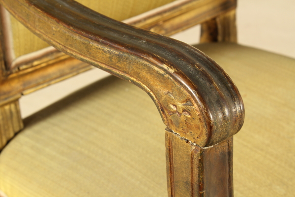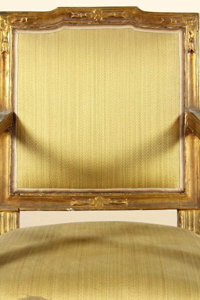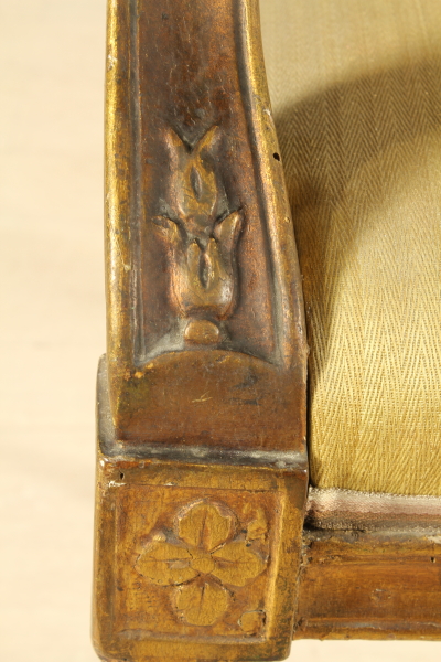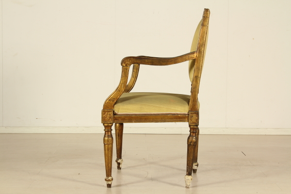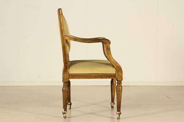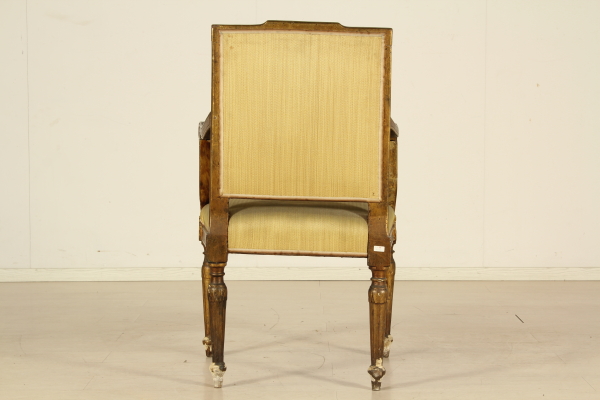 Poltrona alla reine con quattro gambe tronco-coniche intagliate come il resto della poltrona con motivi tipici.