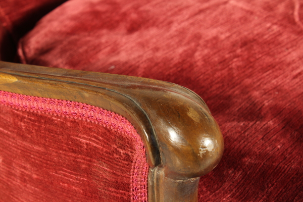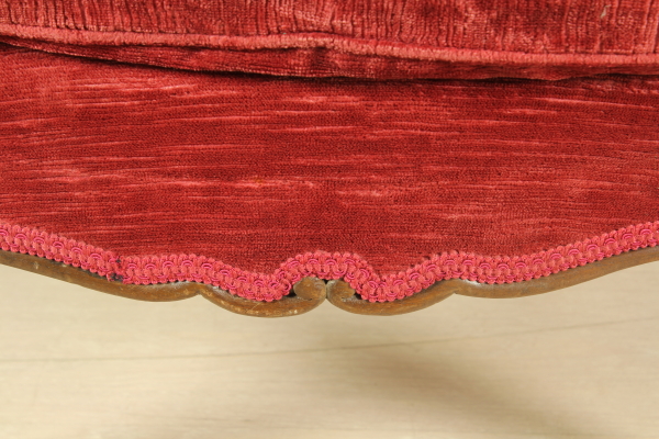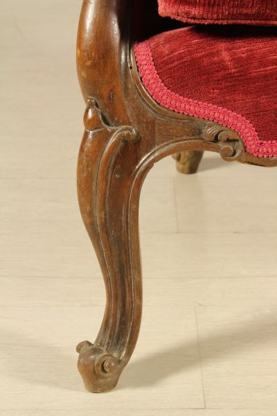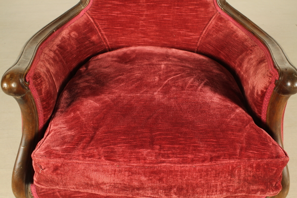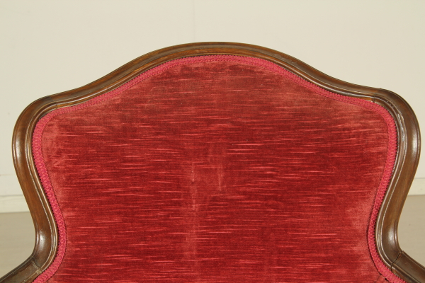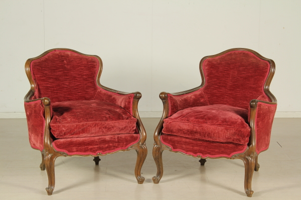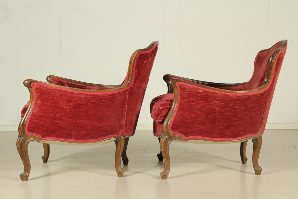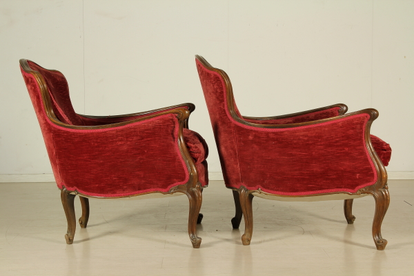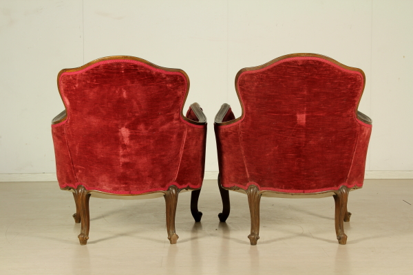 Poltrone a pozzetto dalla linea elegante rette da gambe mosse. Schienale e seduta imbottita.