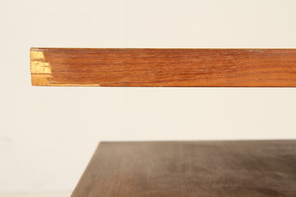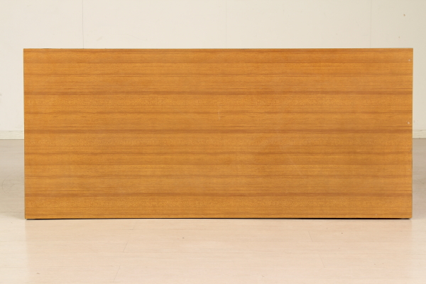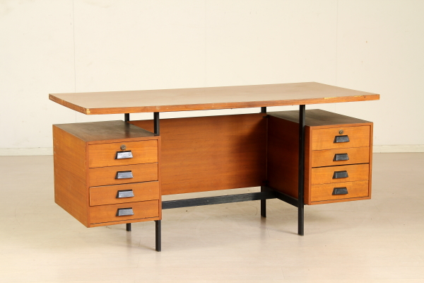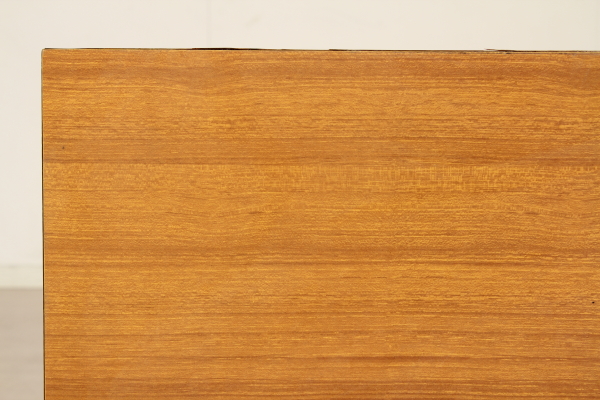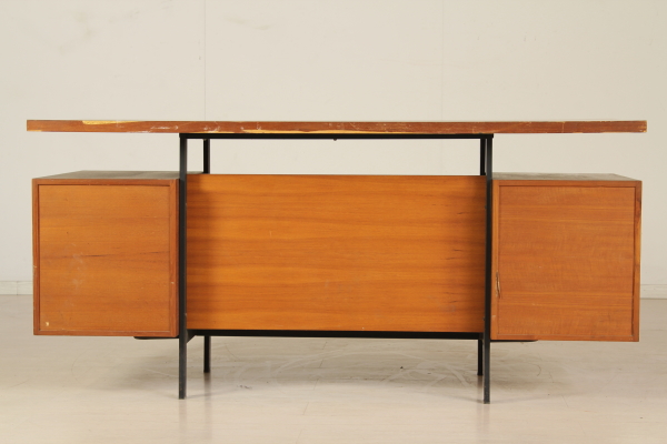 Scrivania con cassetti; legno impiallacciato teak, piano ricoperto in formica. Buone condizioni, presenta piccoli segni di usura.