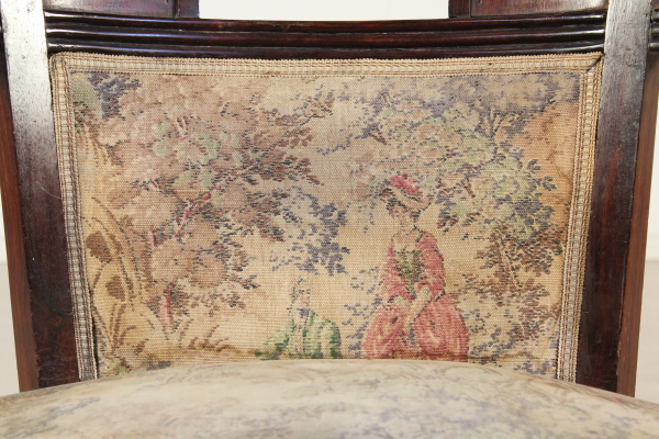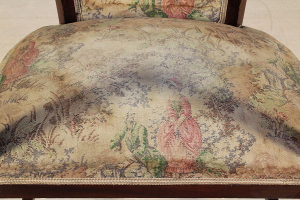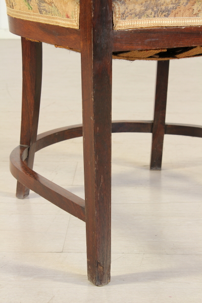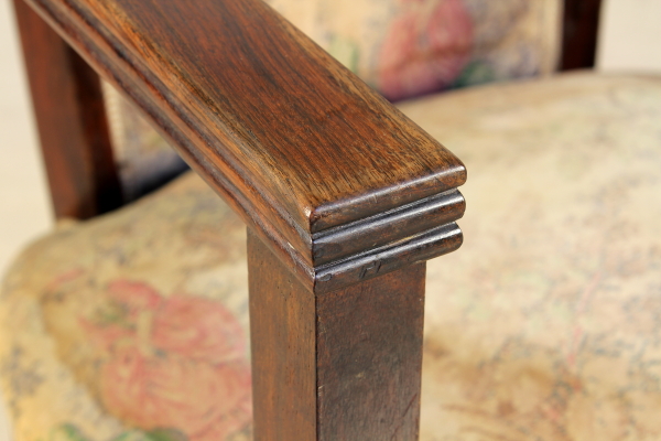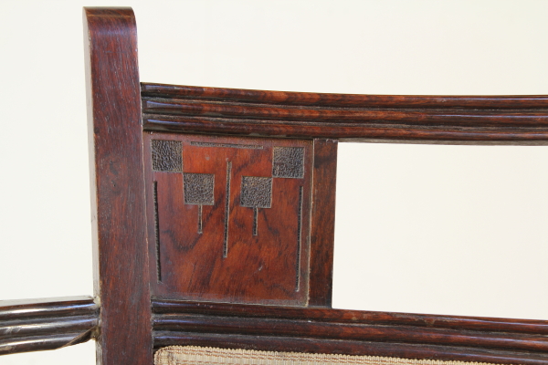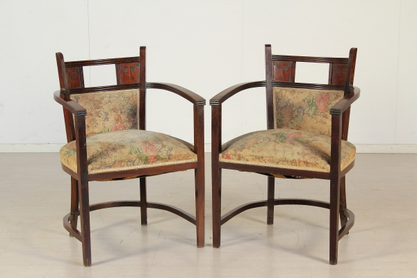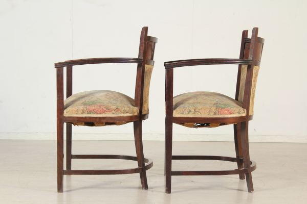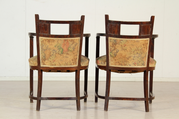 Coppia di poltrone costruite a scanno in palissandro massello. Schienale e seduta imbottiti, con parte dello schienale a giorno con intagli tipici dello stile.