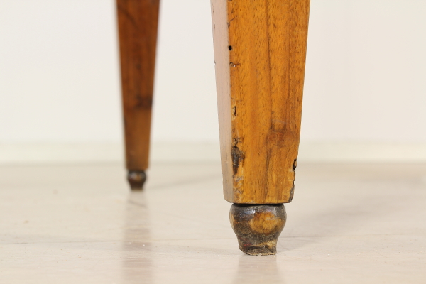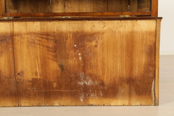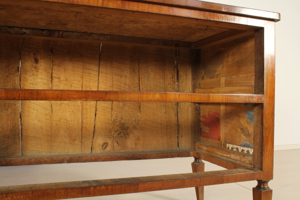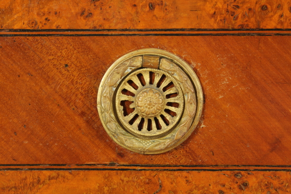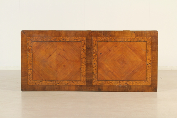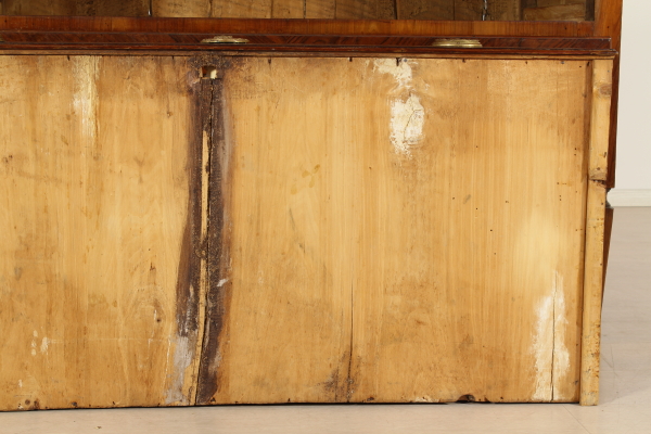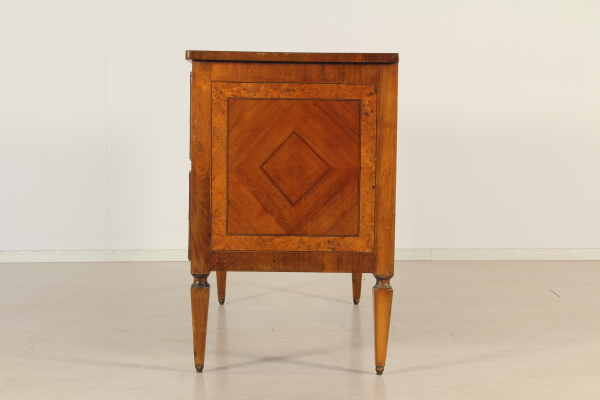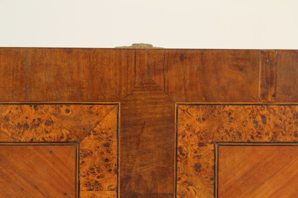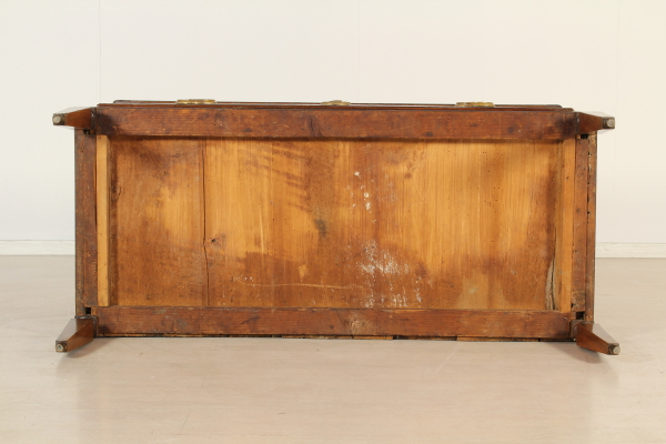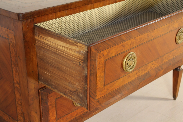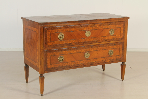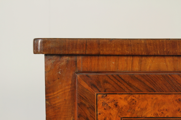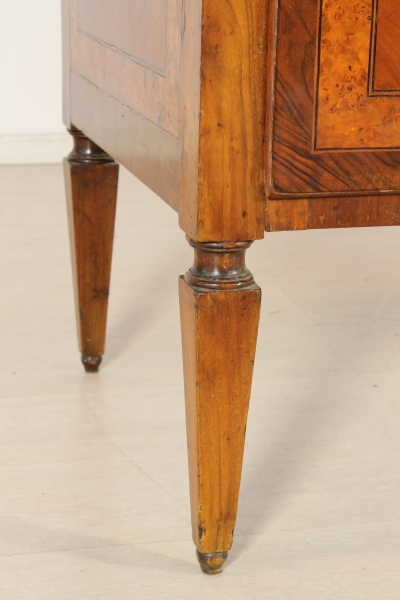 Cassettone a due cassetti lastronato sull'intera superficie in ciliegio bipartito e quadripartito con bordure in radica di pioppo filettate in acero ed ebano. Maniglie in bronzo originali con serratura coeva che permette la chiusura di entrambi i cassetti. Piedi tronco-piramidali ed interni in pioppo.