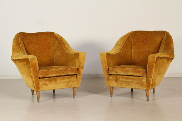 Coppia di poltrone anni 40/50; imbottitura a molle, rivestimento in velluto. Discrete condizioni, presentano alcuni segni di usura.