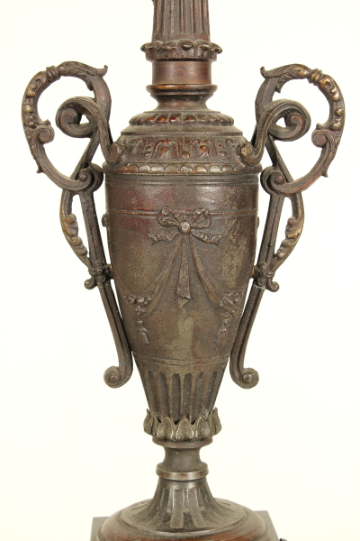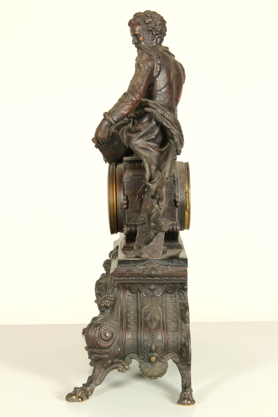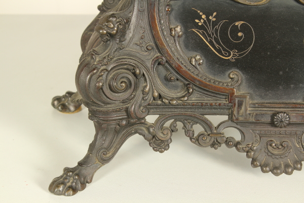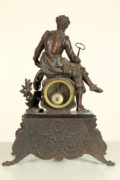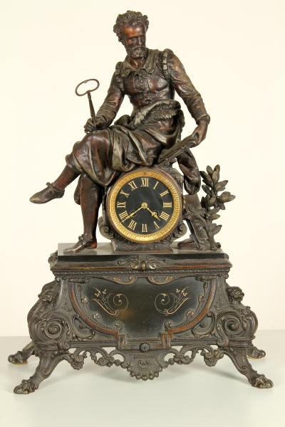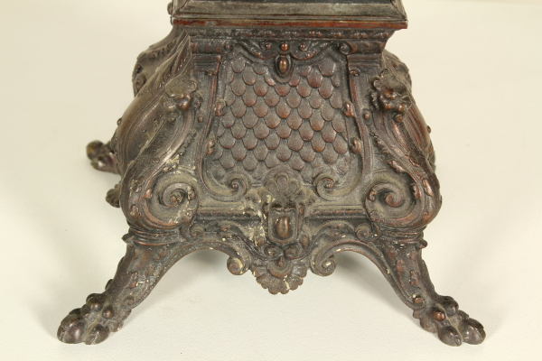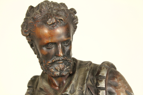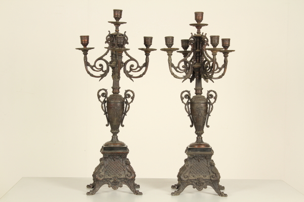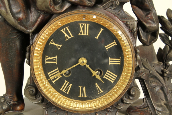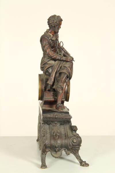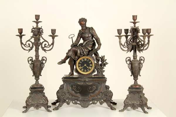 Trittico da camino in zama e marmi composto da: coppia di candelabri a base quadrata retta da piedi ferini, a foggia rinascimentale, da quale parte il fusto con vaso all'antica reggente bracci con decoro vegetale; orologio su cui poggia la figura di Torquato Tasso in atto di scrivere la "Gerusalemme Liberata". Misure candelabri: 63x20x22cm - Misure orologio: 60x45x20cm