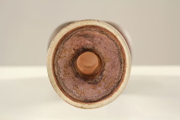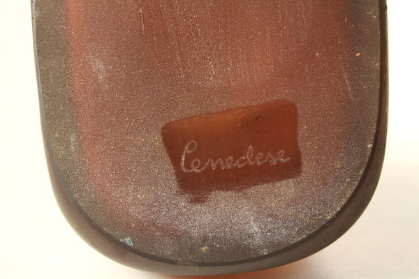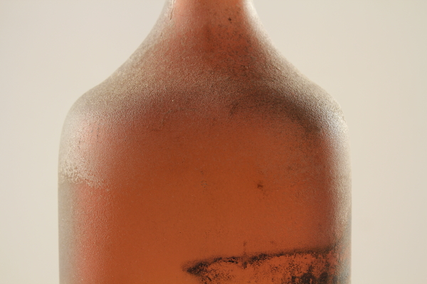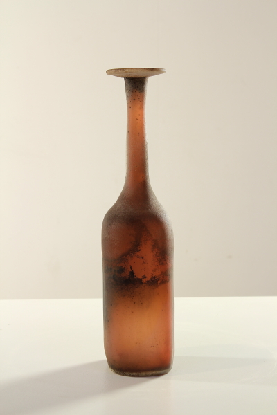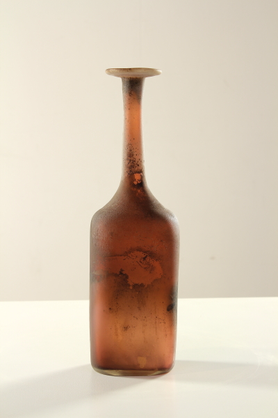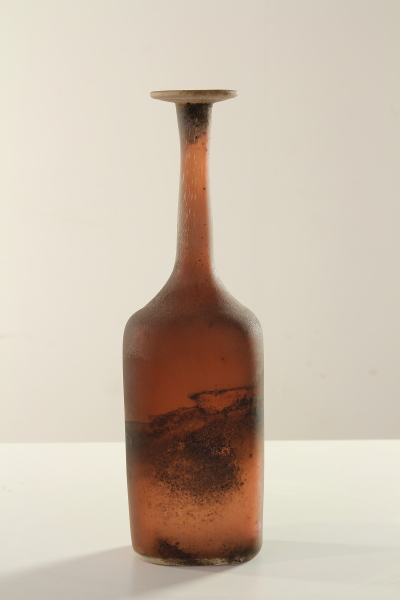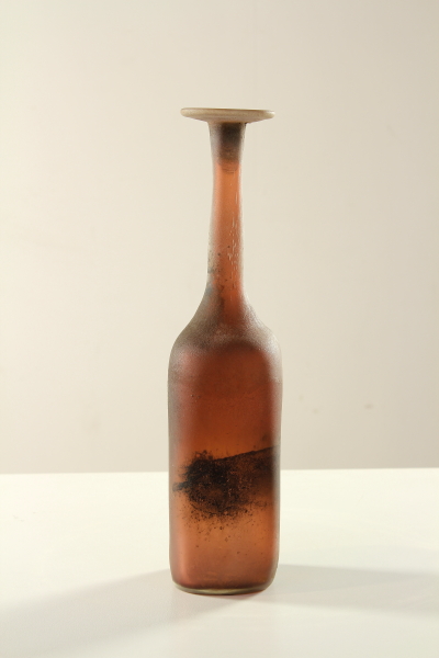 Bottiglia in vetro di Murano, della collezione Scavo, è realizzato in vetro soffiato. In fase di esecuzione, questo tipo di vetro assume un aspetto anticato; ciò avviene grazie all'utilizzo di sali ed ossidi che reagiscono alle alte temperature.