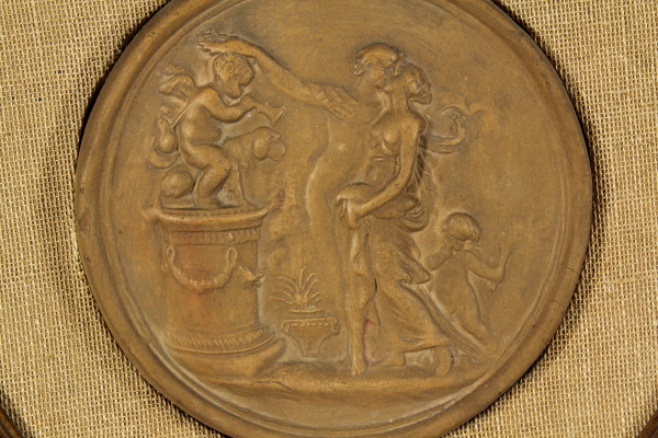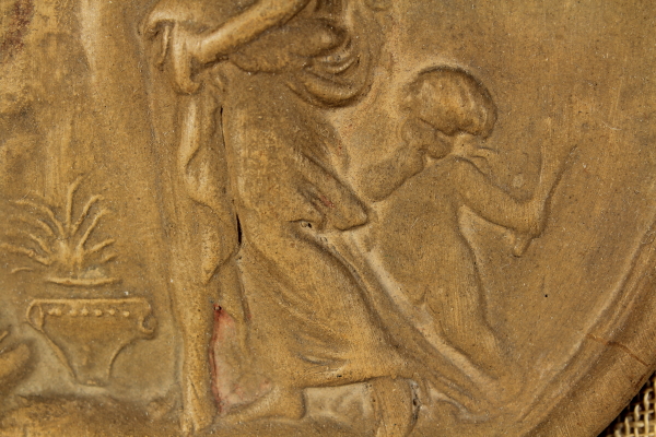 Medaglione in terracotta la quale scena, secondo la tradizione, rappresenta il momento precedente alla partenza di Adone per la battuta di caccia, nella quale verrà ucciso da un cinghiale.