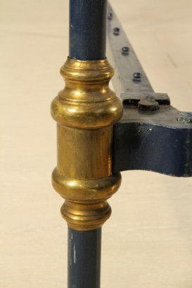 Letto in ferro battuto presenta montanti cilindrici terminanti con sfere di ottone. Traversa, rosoni e fregi in ottone. Dipinto blu.