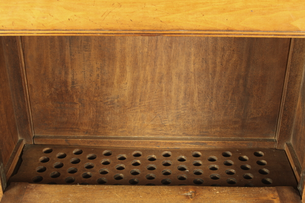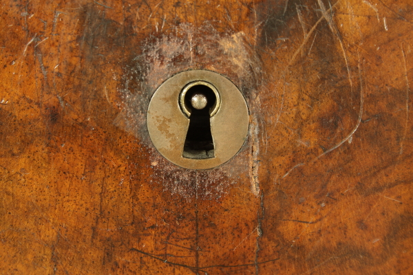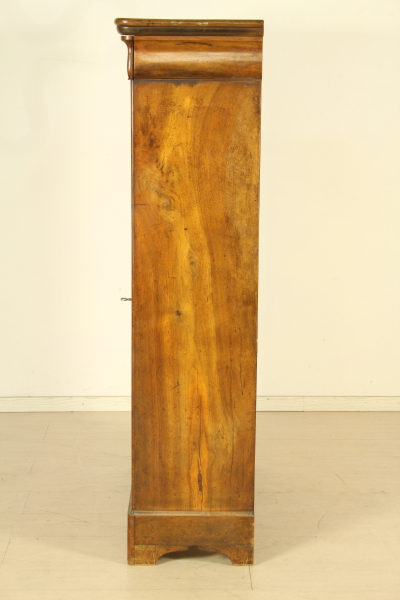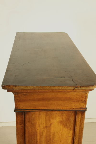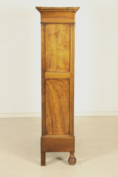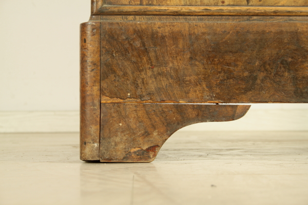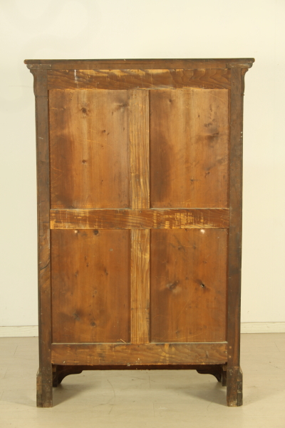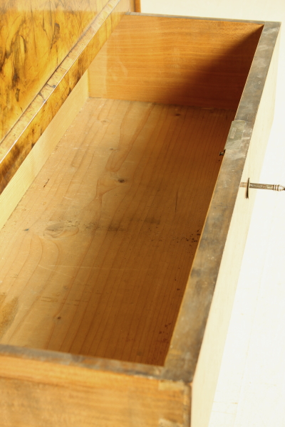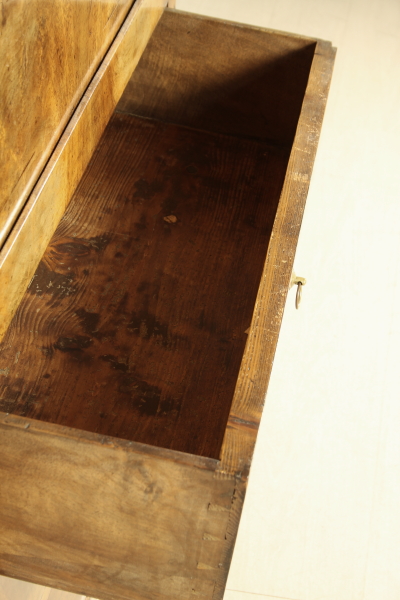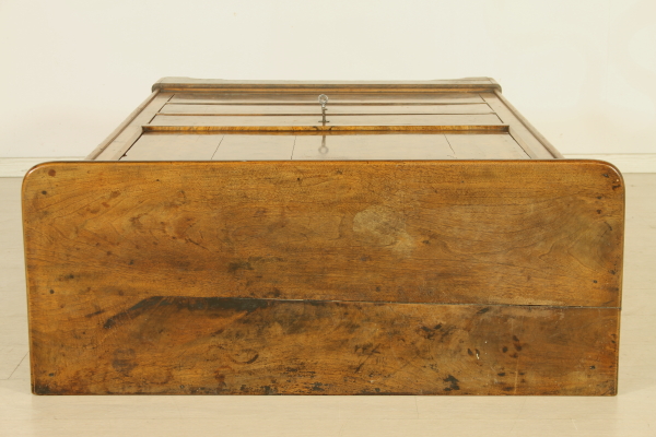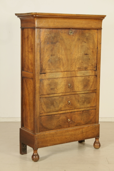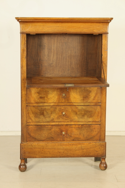 Secretaire a tre cassetti conanta a ribalta. Fascia sottocoperchio a gola di tulipano. Il fronte è lastronato in piuma di noce bipartito. All'interno vani portaoggetti. Piedi a mensola ed in interni in pioppo.