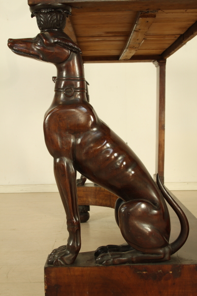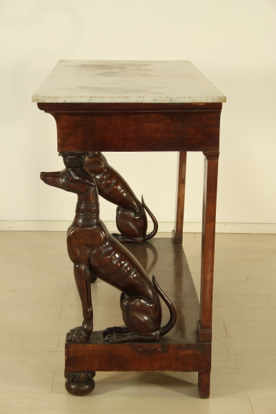 Consolle con levrieri, parietale con piano in marmo bianco di Carrara con montanti che raffigurano due levrieri finemente intagliati in mogano massello a tuttotondo. Fascia sottopiana sagomata e lastronata in piuma di mogano con cassetto. Piedi a trottola con intaglio a foglia.