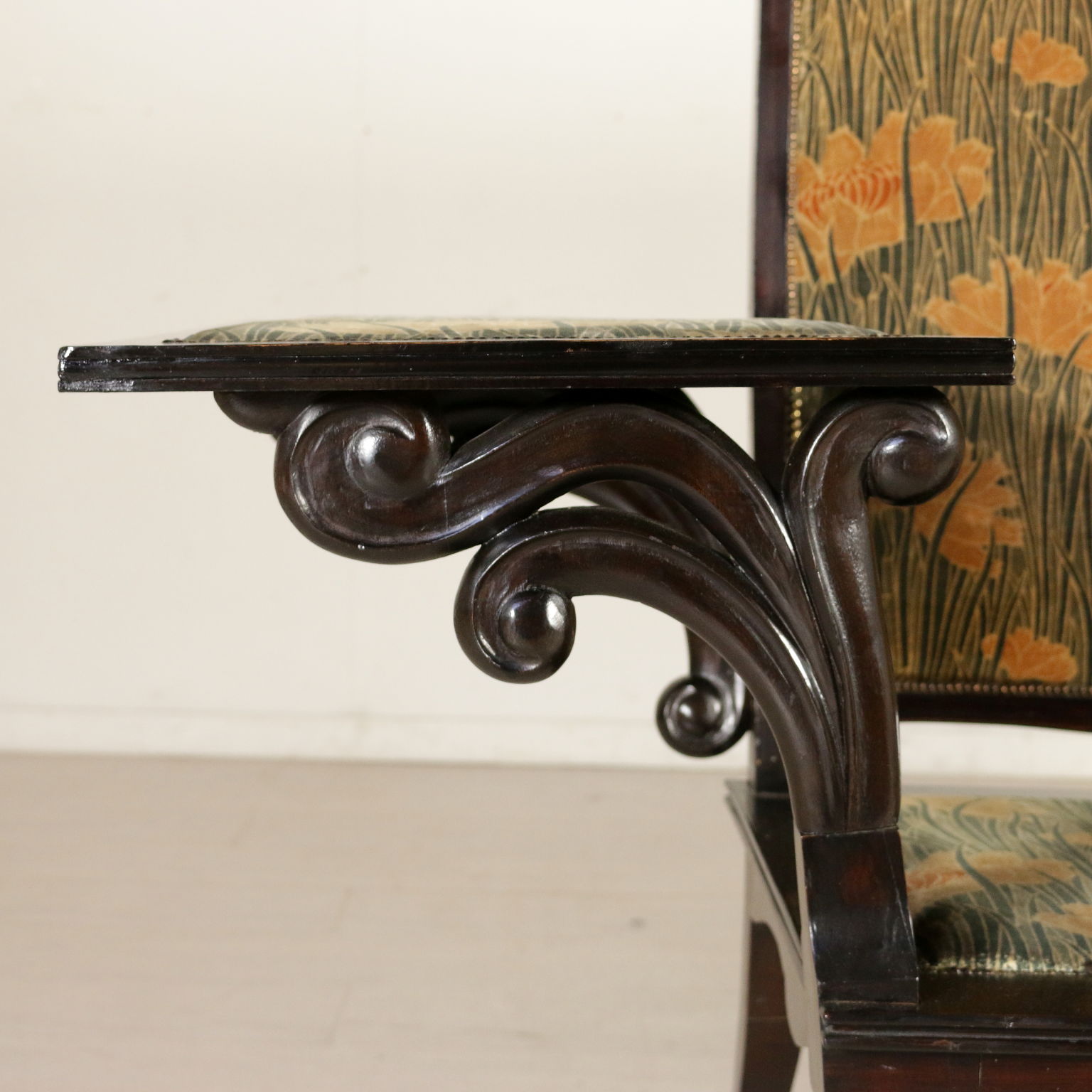 Elegante salotto liberty composto da divano (154x196x61 cm), quattro sedie (118x45x43 cm) e due poltrone (125x58x51 cm). Presenta struttura in legno ebanizzato intagliato a motivi curviformi a sfondo vegetale. Il divano porta specchio sagomato e bisellato nell'angolo destro e pianetto d'appoggio sul bracciolo opposto. Il modello perfettamente riconoscibile è mancante del fregio intagliato a decorazione della spalliera. Sedute e schienali imbottiti e ricoperti con tessuto floreale originale.