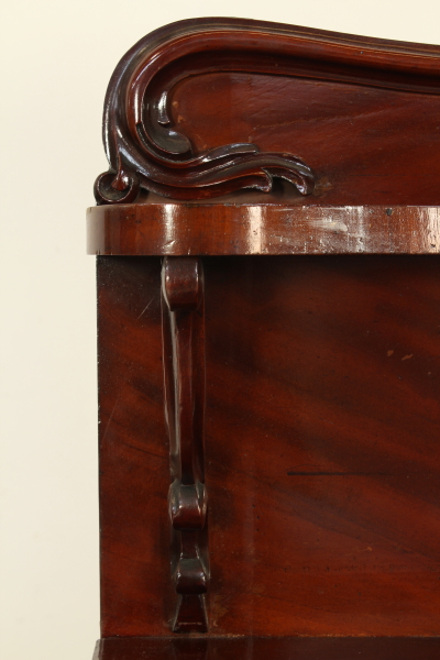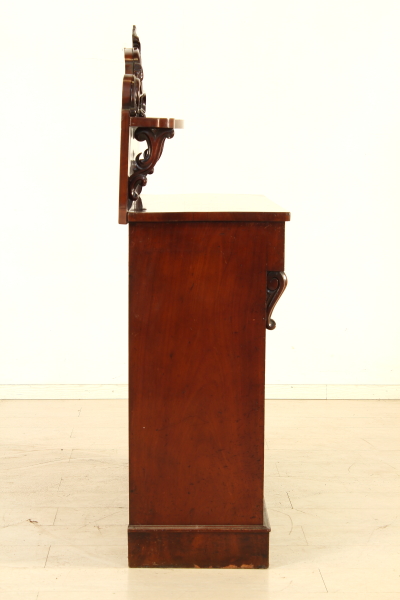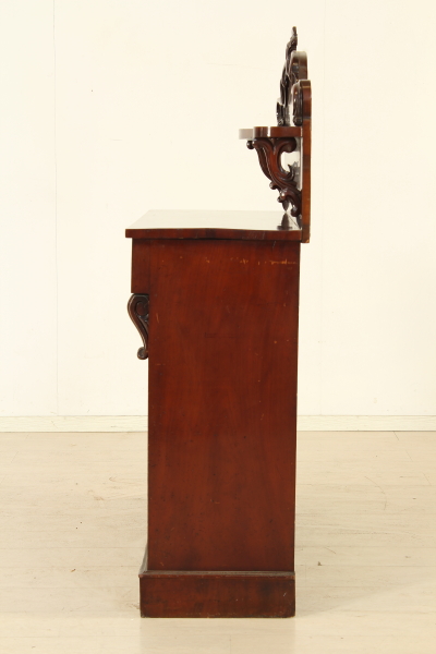 Credenza con alzata, presenta due ante e cassetto sagomato. Sul fronte lesene intagliate. Alzatina sagomata e intagliata presenta ripiano retto da lesene.