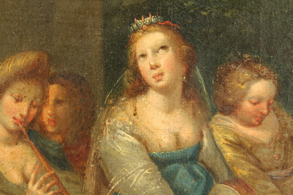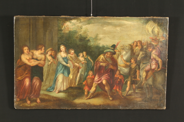 Olio su tela. Scuola francese. Reintelato alla fine dell'800; tracce di restauro e piccole integrazioni. Iefte, in cambio della vittoria contro il popolo pagano degli Ammoniti, fece voto a Dio di offrirgli in olocausto la prima persona che lo accoglierà al suo ritorno dalla guerra. L'opera rappresenta il momento conclusivo dell'episodio biblico: quando l'unica figlia di Iefte, per prima, va incontro al padre danzando con il tamburello per festeggiare la sua vittoria. Il dipinto si presenta senza cornice.