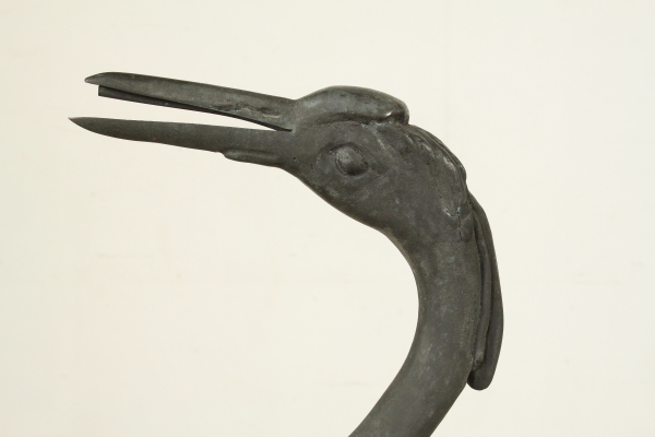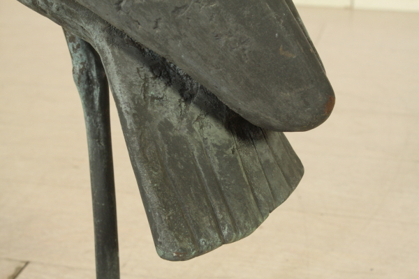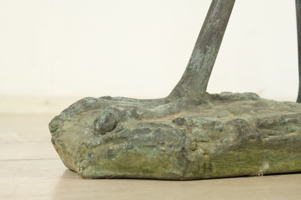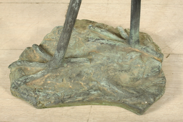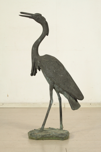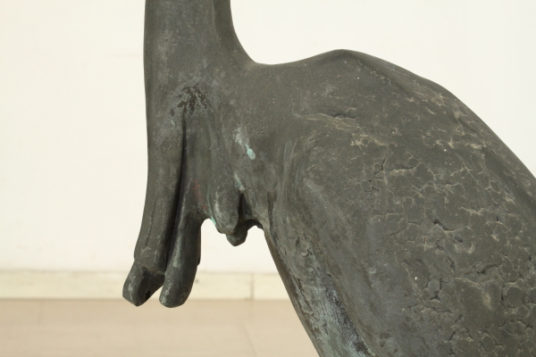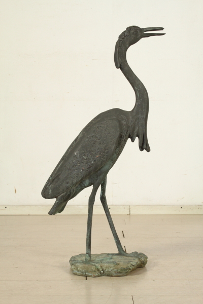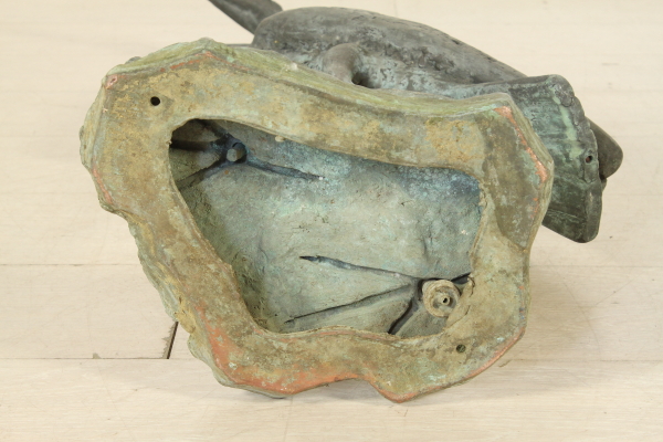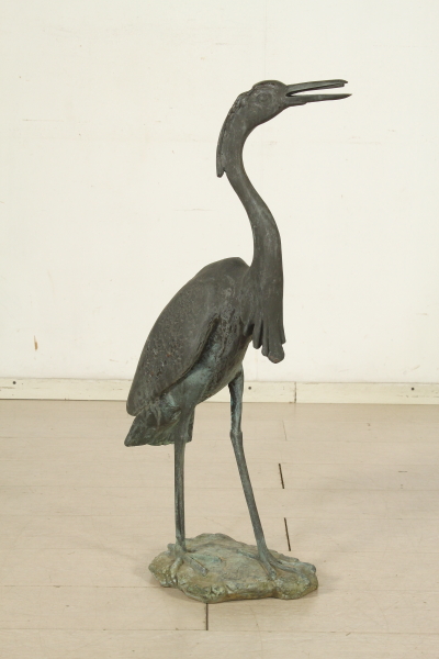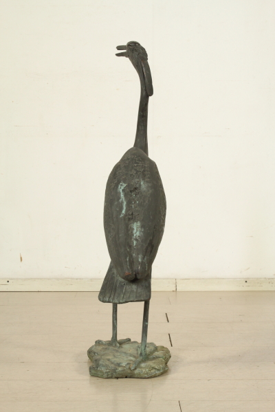 In rame brunito. La scultura presenta un tubo e un attacco per la funzione di fontana da giardino.