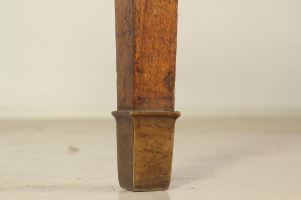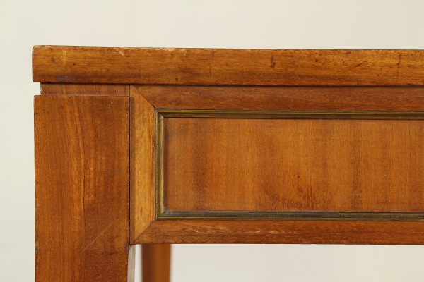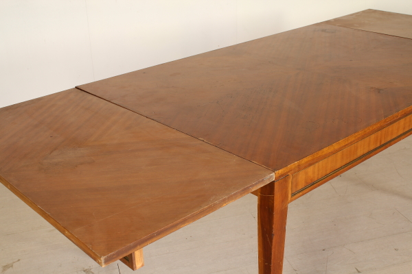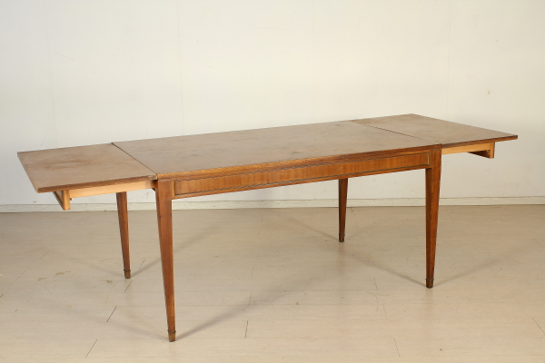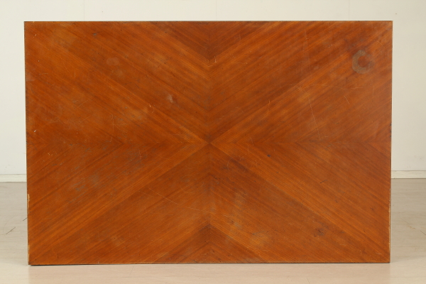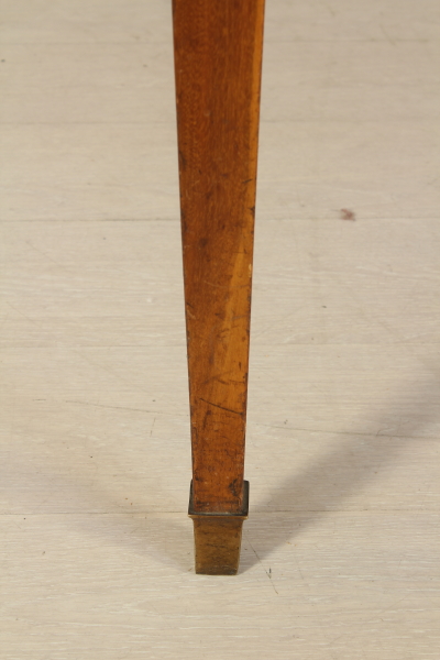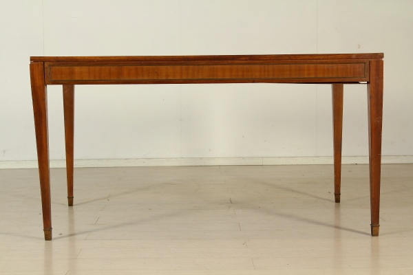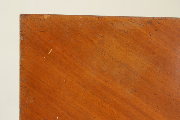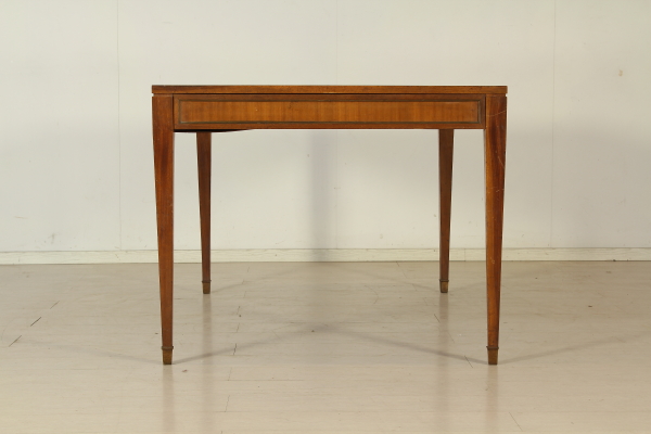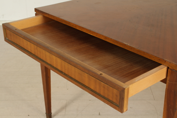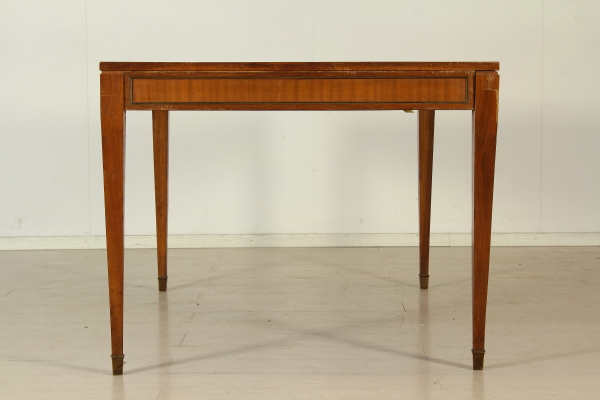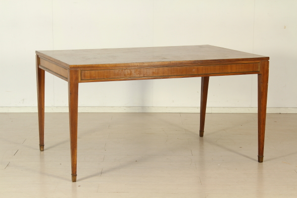 Tavolo; legno impiallacciato mogano, particolari in ottone. Discrete condizioni, presenta alcuni segni di usura.