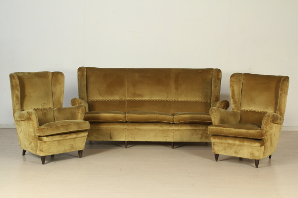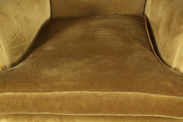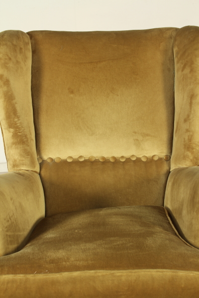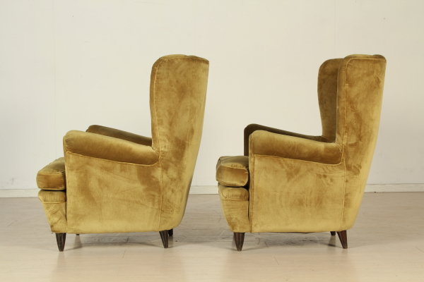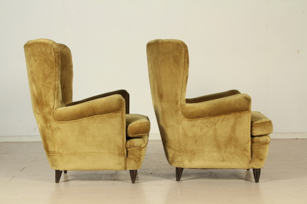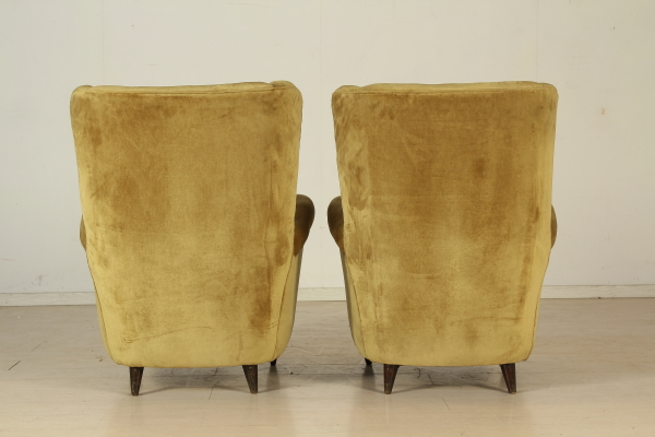 Poltrone anni 50; imbottitura a molle, rivestimento in velluto. Buone condizioni, presentano piccoli segni di usura.