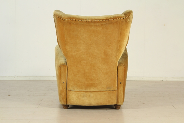Poltrona anni 40-50 con schienale reclinabile; imbottitura a molle e nastri metallici, rivestimento in velluto. Discrete condizioni, presenta alcuni segni di usura.