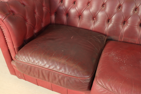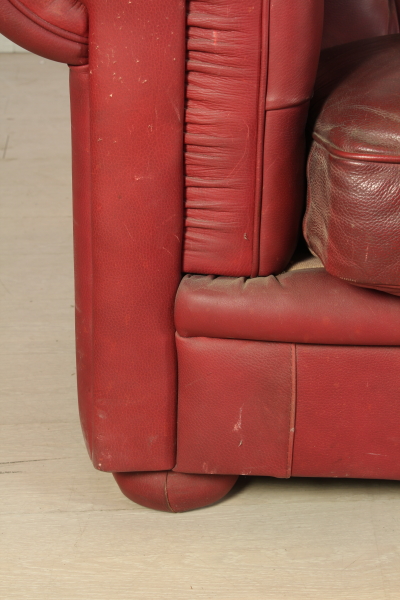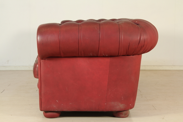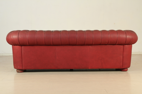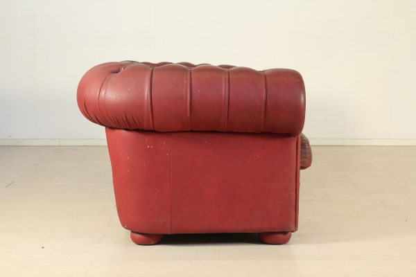 Divano in stile "Chesterfield tre posti; imbottitura in espanso, rivestimento in similpelle. Buone condizioni, presenta piccoli segni di usura.