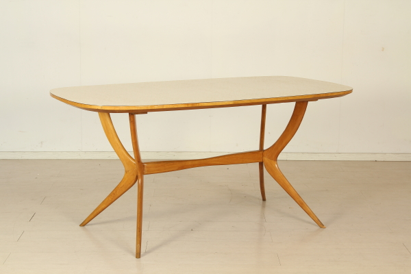 Tavolo anni 50; struttura in legno di faggio, piano in legno ricoperto in formica. Buone condizioni, presenta piccoli segni di usura.