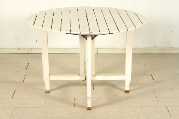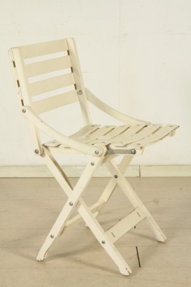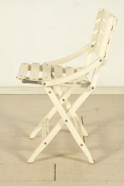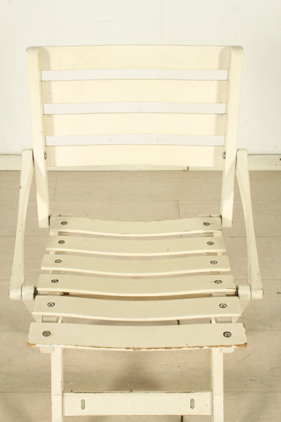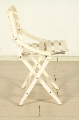 v, tutti pieghevoli; legno verniciato per esterni. Discrete condizioni, presentano alcuni segni di usura. Misure: Sedie; H.77, L.46, P.40, Tavolo; H.70, Diametro 102