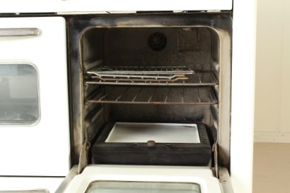Cucina a cinque fuochi più due scomparti forno; metallo smaltato. Buone condizioni, presenta piccoli segni di usura, non è stata provata.