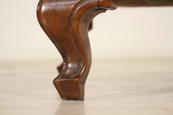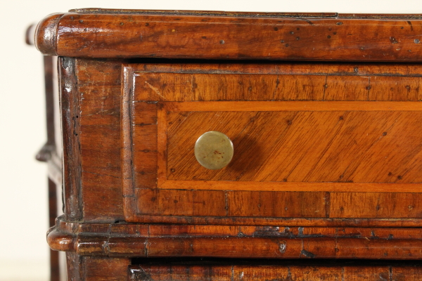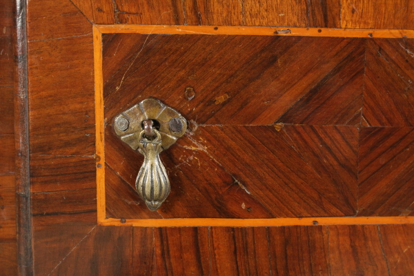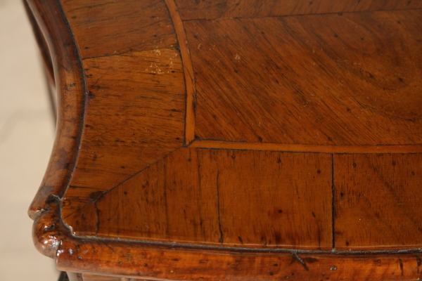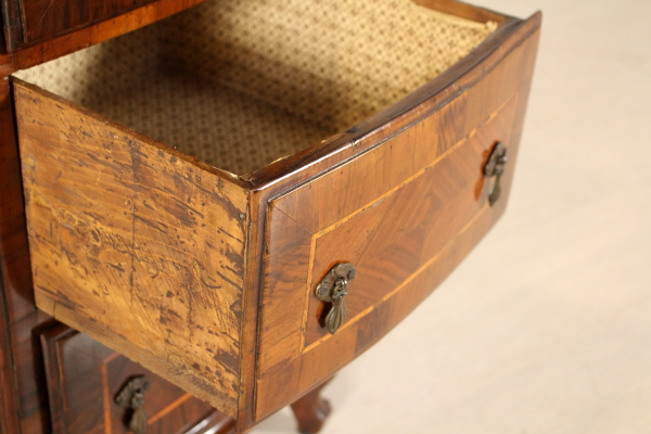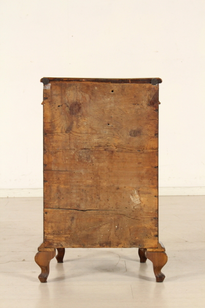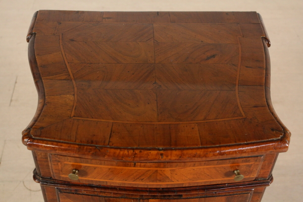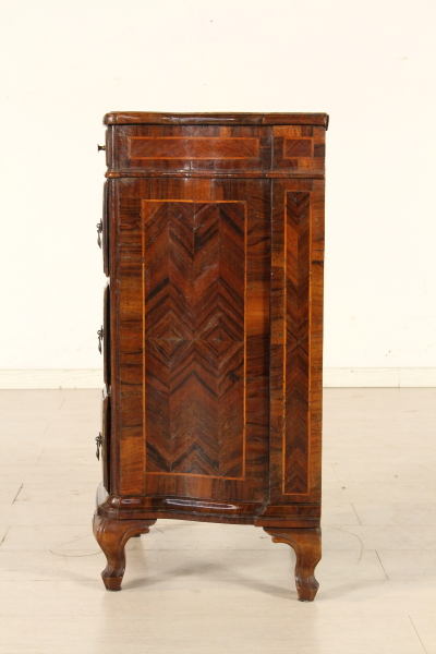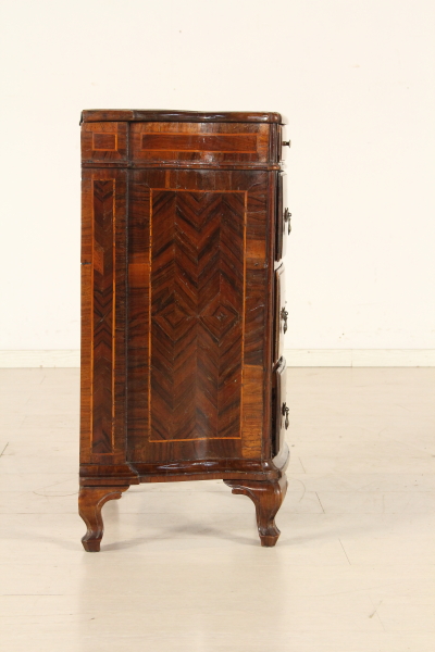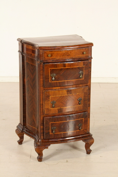 Comodino lastronato. Mosso sul fronte e nei fianchi presenta quattro cassetti e piano sagomato. Riserve quadripartite in noce venato e filettature in bosso. I piedi mossi sono stati sostituiti in epoca successiva. Ha subito restauri.