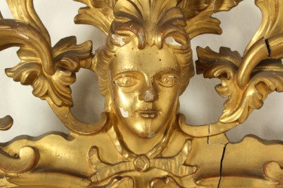 Specchiere intagliate e dorate a foglia sull'intera superficie. Le cornici a linea mossa hanno cimase con intagli fogliacei e visi muliebri al centro. Nella parte inferiore intagli a cartoccie con anelli che reggevano in origine bracci porta-candele in ferro battuto. Specchi al mercurio con tralci di fiori incisi.