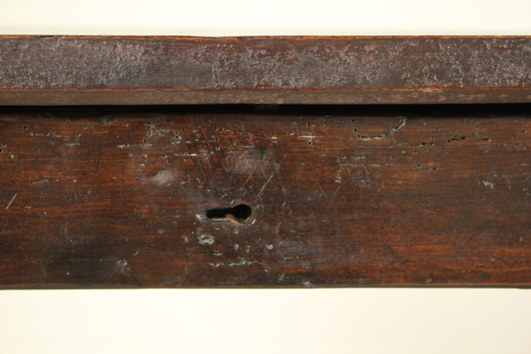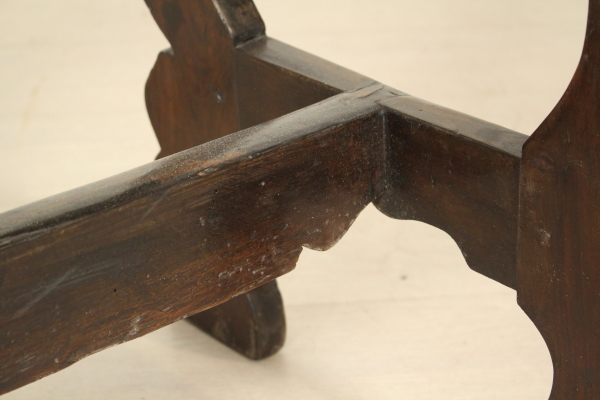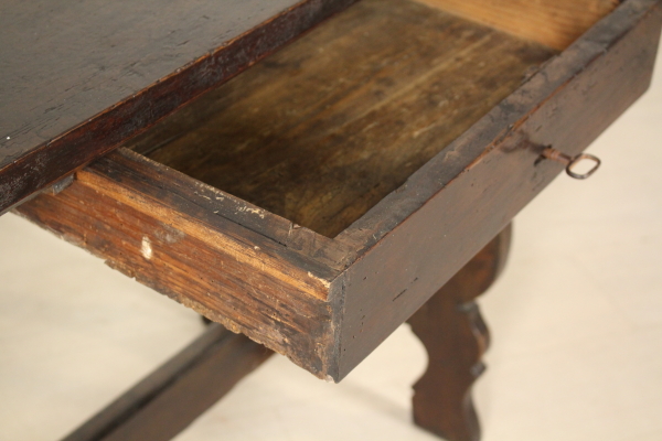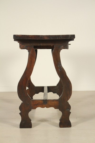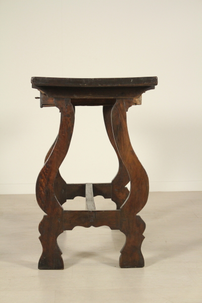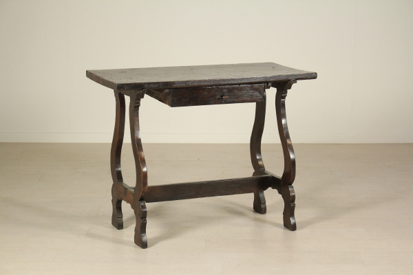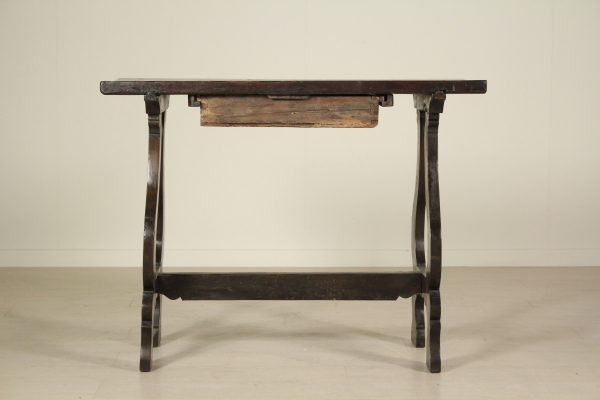 Fratino- scrittoio. Retto da gambe a lira raccordate da traversa presenta piano scorniciato con cassetto sottostante.