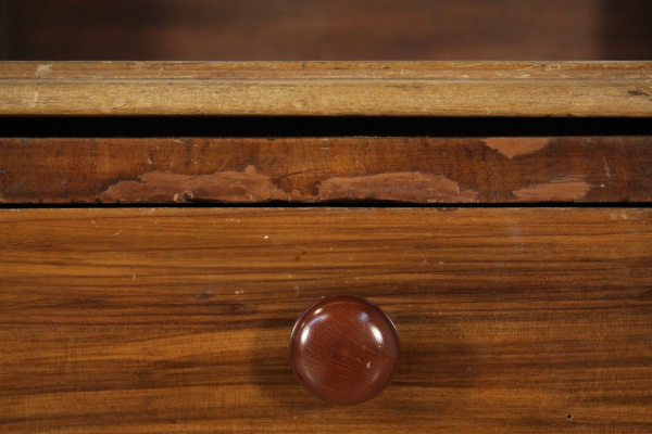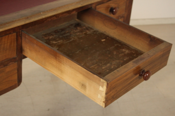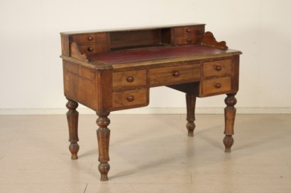 Scrittoio con Alzata. Scrittoio da centro retto da gambe tornite presenta cinque cassetti. Piano estraibile con inserto in pelle. Alzatina con quattro cassetti e vano a giorno. Pomoli sostituiti successivamente.