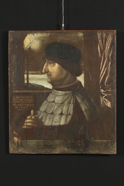 Ritratto di Bartolomeo di Urbino. Olio su tela. La didascalia identifica il personaggio in Bartholomeus de Urbino, nominato lettore giurista alla università di Padova con lettera ducale nel XV secolo e morto nel 1528. Già reintelato, presenta nonostante le piccole mancanze il fascino della ritrattistica arcaica del '400.