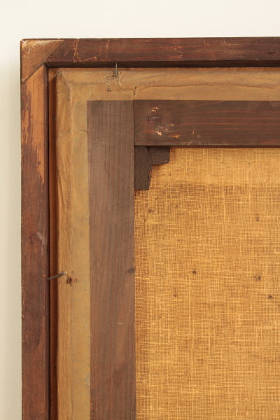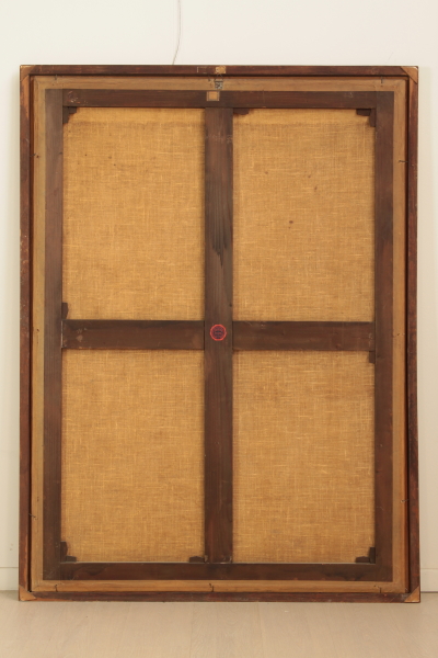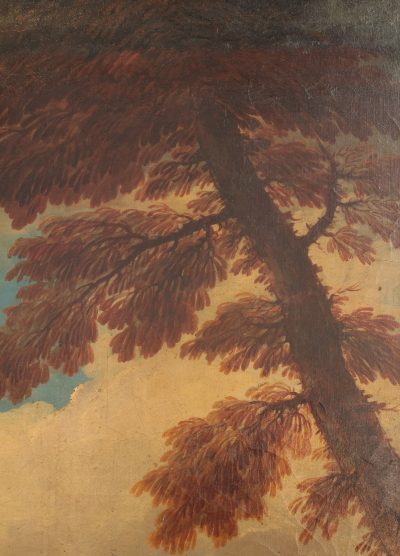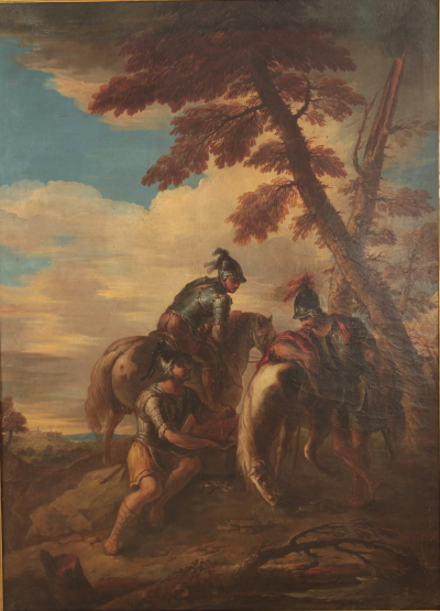 Paesaggio con cavalieri. Olio su tela. Già attribuito a Salvator Rosa (1615-1673), per la scelta del soggetto, si tratta in realtà di un'opera di pieno settecento. I tre cavalieri, accuratamente descritti con pennellata sciolta, sono presentati nel momento della spedizione del bottino di guerra. Reintelato e presentato in cornice recente senza vetro.