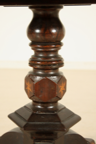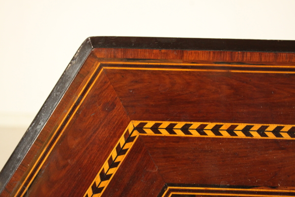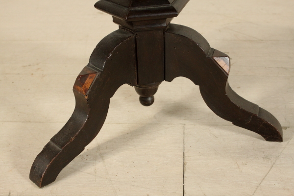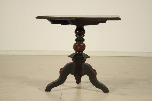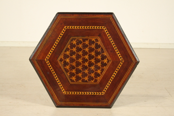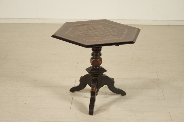 Tavolino intarsiato. Retto da balaustro centrale terminante con tre piedi mossi presenta piano esagonale ribaltabile a vela. Presenta intarsi geometrici su gamba e piano.