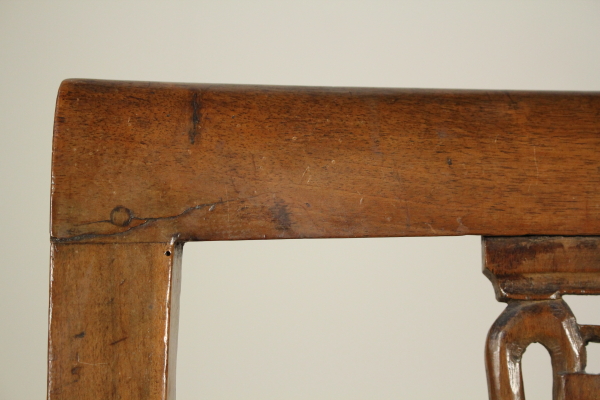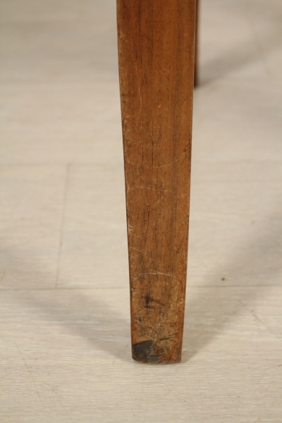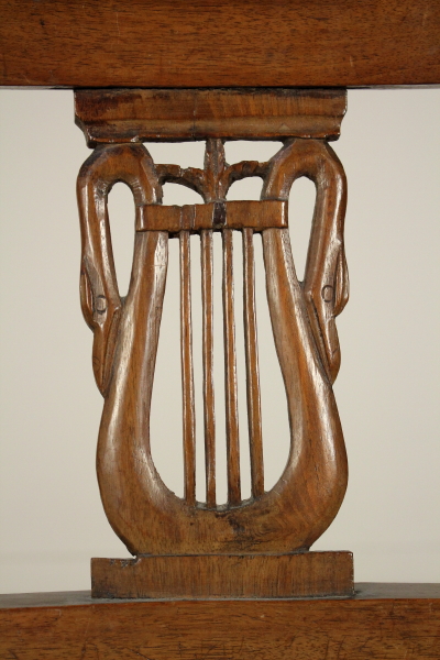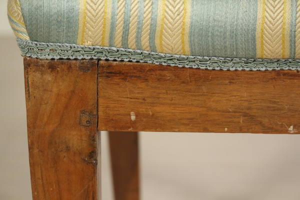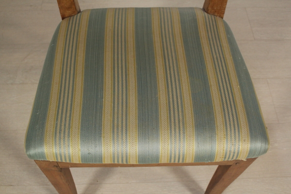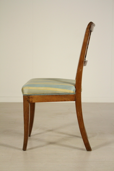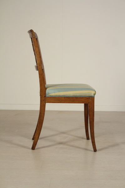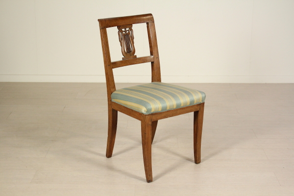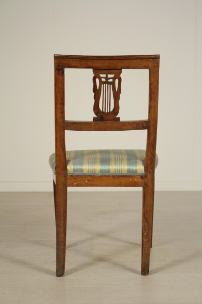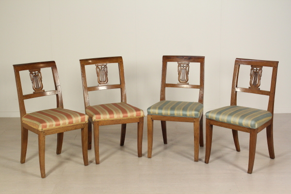 Gruppo quattro sedie neoclassiche. Rette da gambe a sciabola presentano schienale a giorno con lira intagliata. Seduta imbottita.