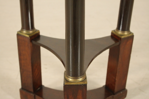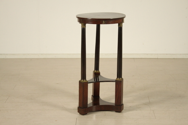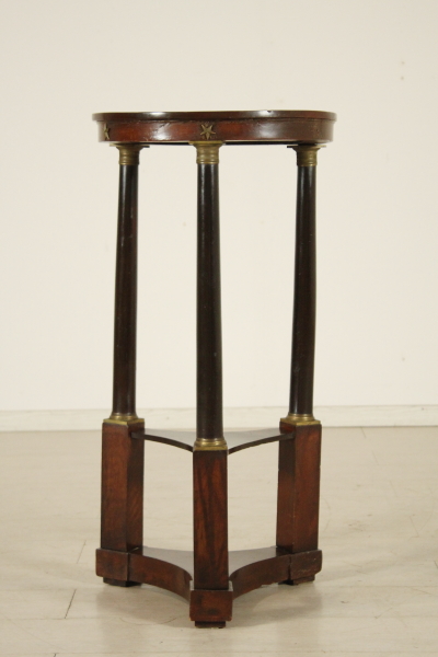 Gueridon Impero. Retto da basamento tripartito presenta montanti a plinto raccordati da ripiano sagomato e colonne intere ebanizzate con capitelli in bronzo dorato. Fregi nella fascia e piano tondo.