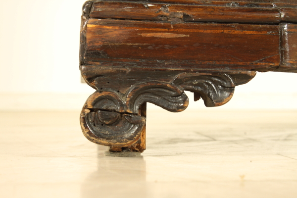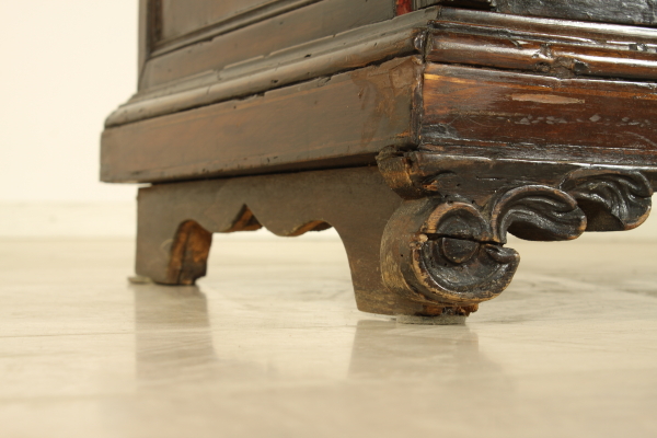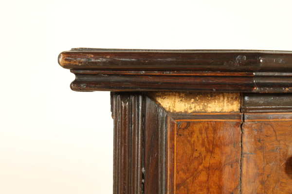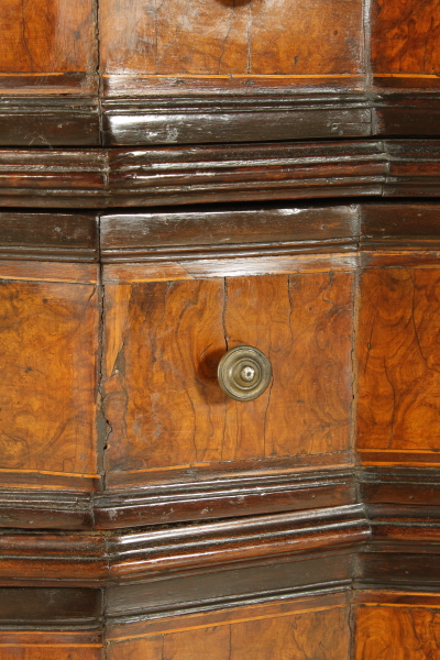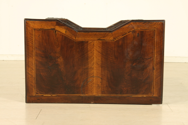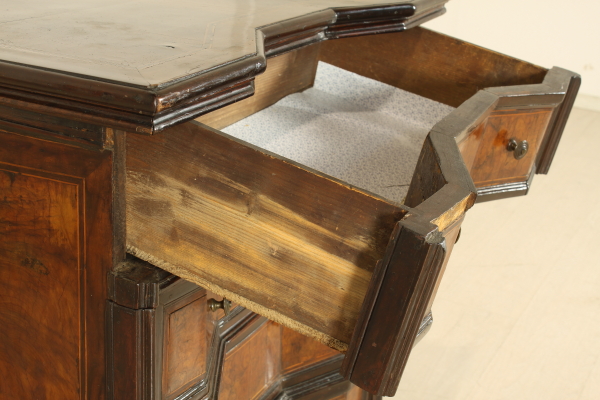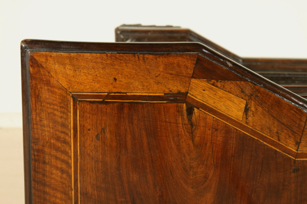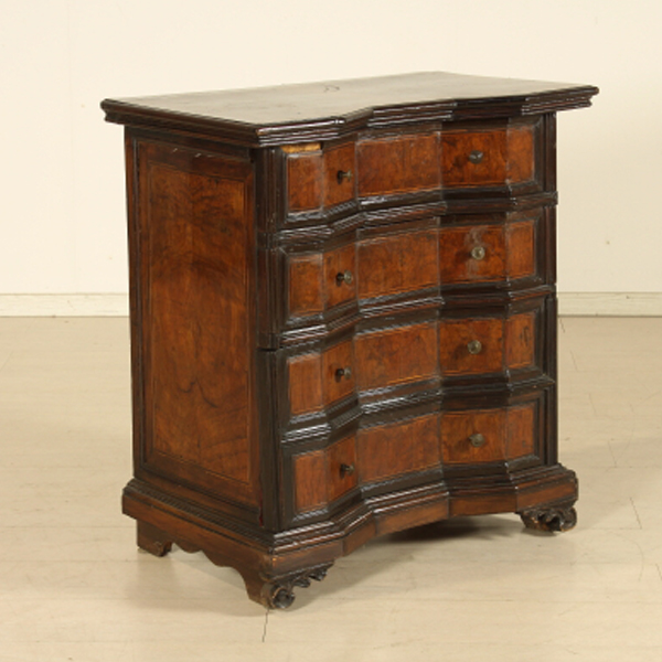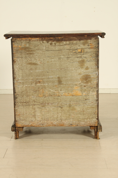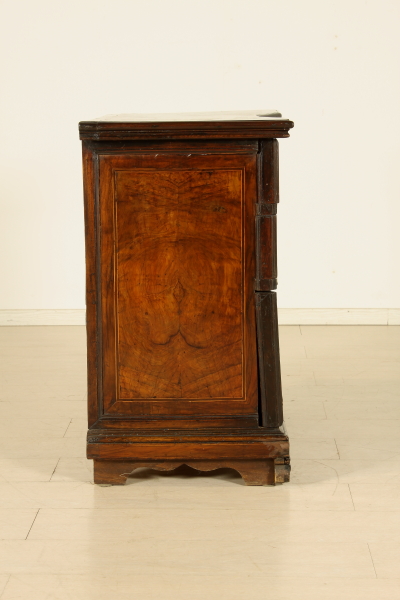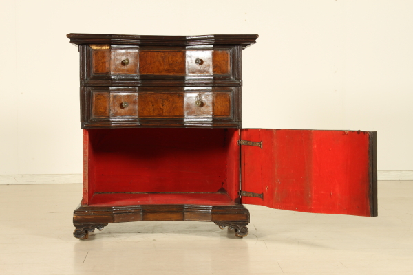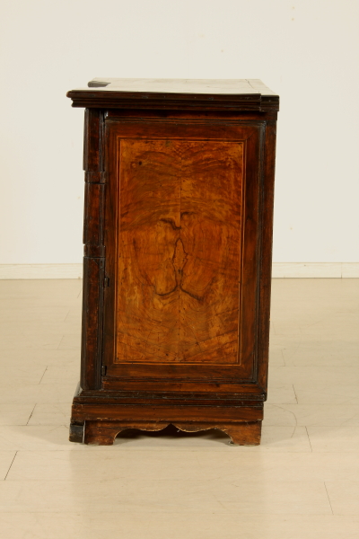 Mobiletto a fronte spezzato con due ante lastronato sul fronte e sui fianchi in noce , ulivo e con filettature in acero. Cornici ebanizzate e piedi a mensola intagliati. In origine il mobile aveva due cassetti trasformati in antina in epoca successiva.