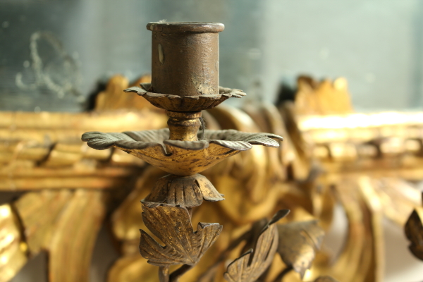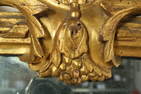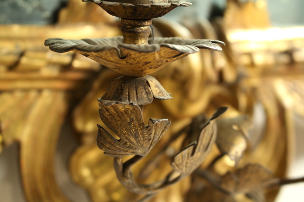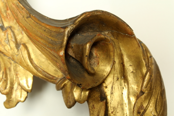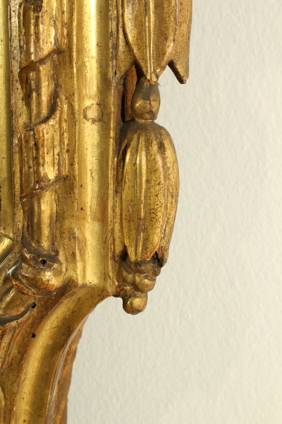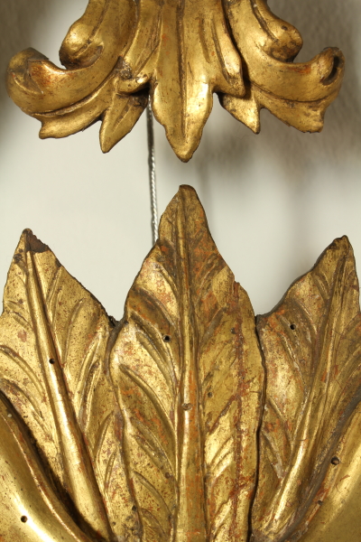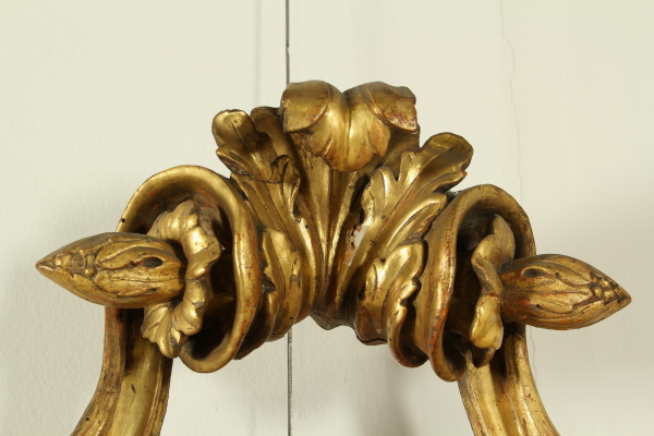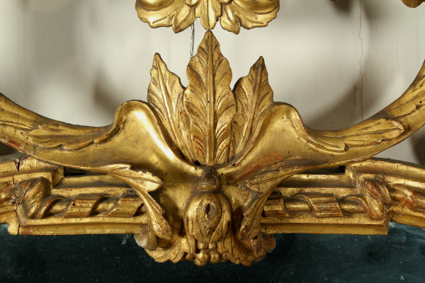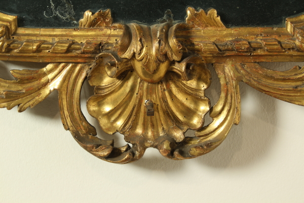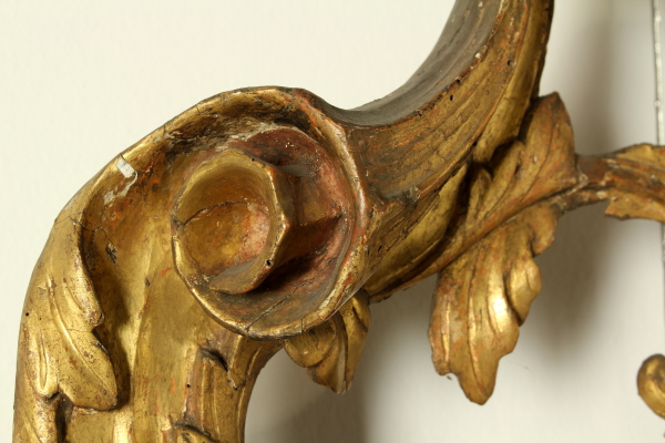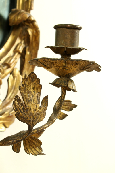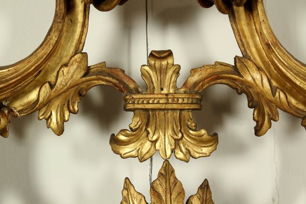 Quattro specchierine (ventole) con cornici sagomate ed intagliate a motivi intrecciati con nastri e festoni fogliacei. Cimase traforate a giorno di gusto rocaille che terminano con boccioli contrapposti. Nella parte inferiore conchiglie racchiuse da pendenti fogliacei con doppio braccio in bronzo dorato a rami di foglie e fiori. Specchi al mercurio coevi.