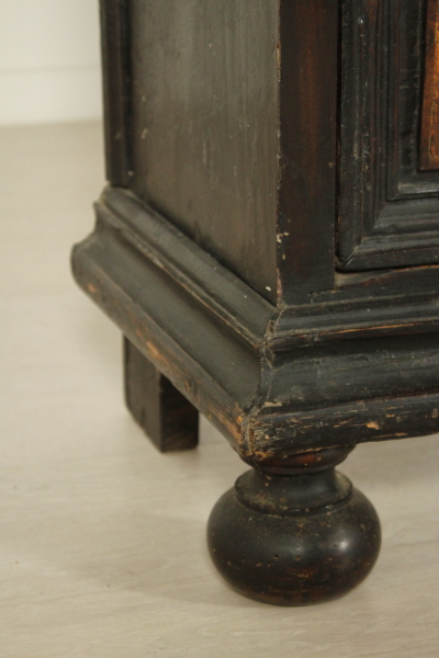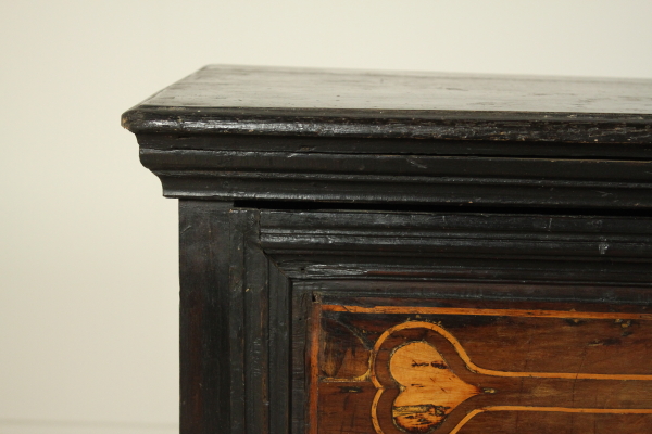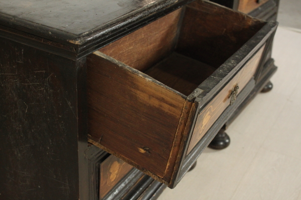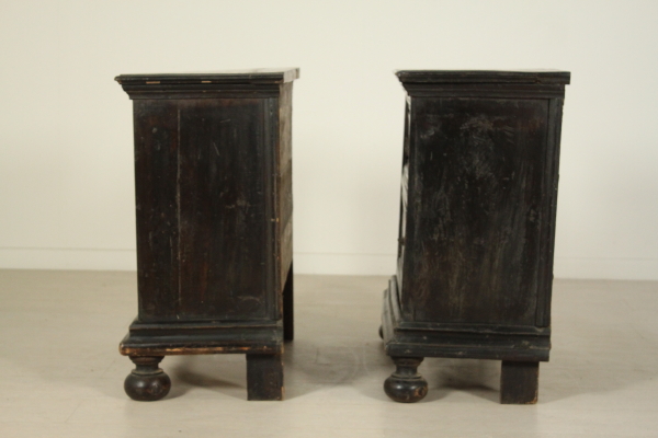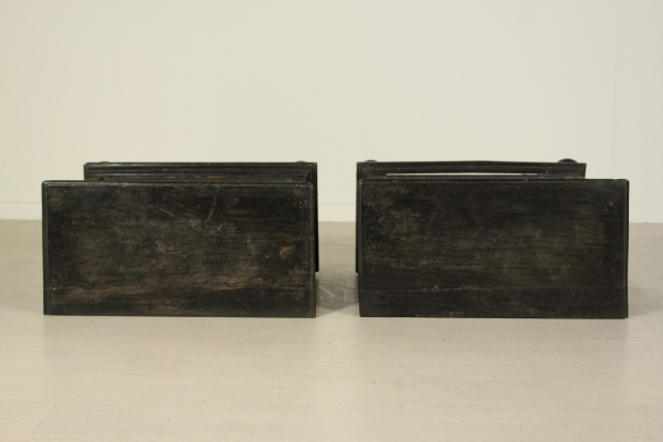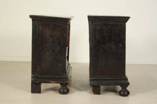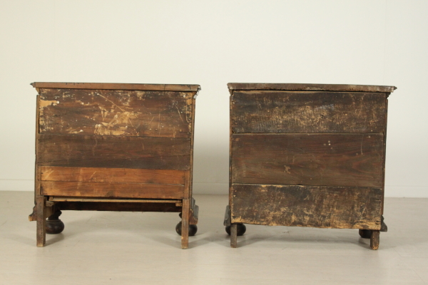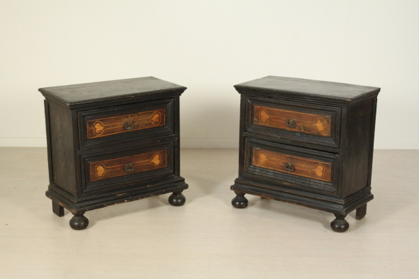 Coppia comodini. Assemblato con parti di mobili antichi è retto da piedi torniti, presenta due cassetti con intarsi a toppo.