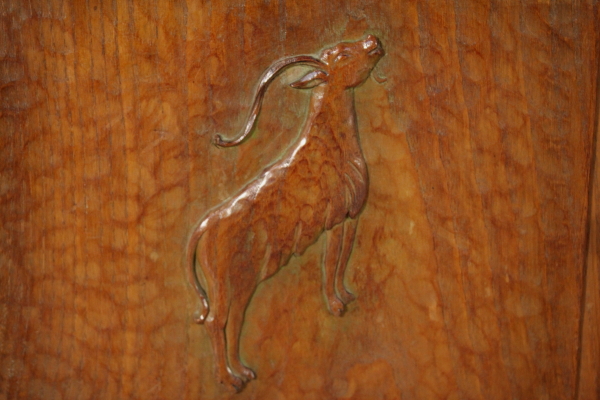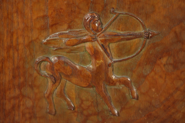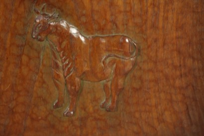 Vetrina anni 50. Mobile vetrina in legno di rovere, formelle decorative intagliate, vetro. Discrete condizioni, presenta alcuni segni di usura.
