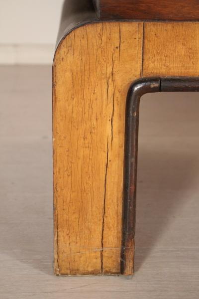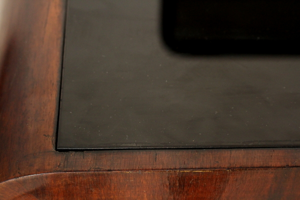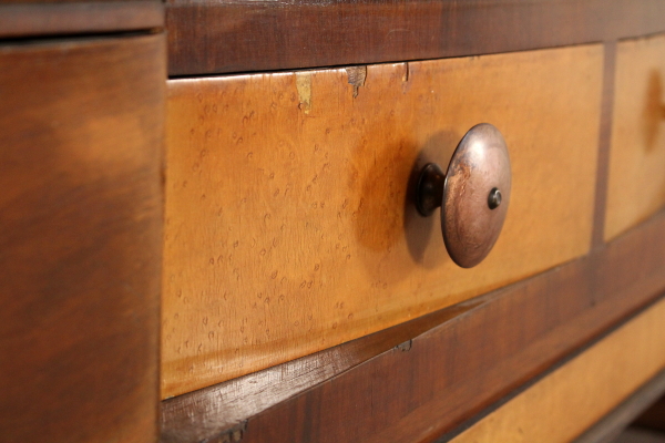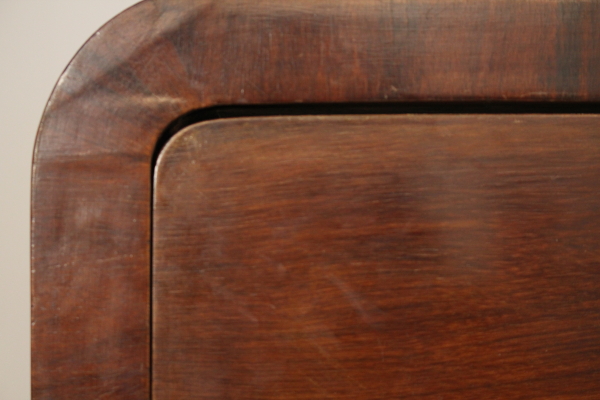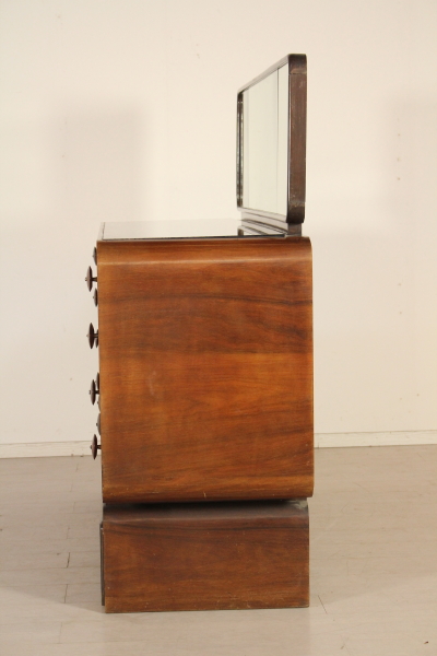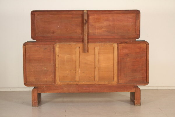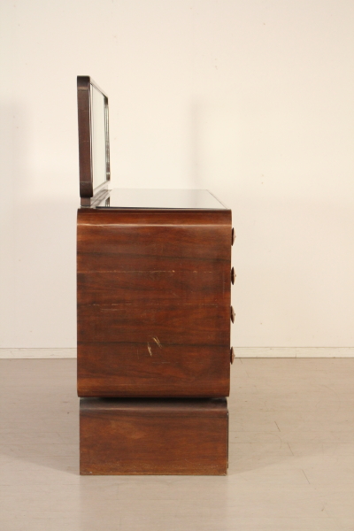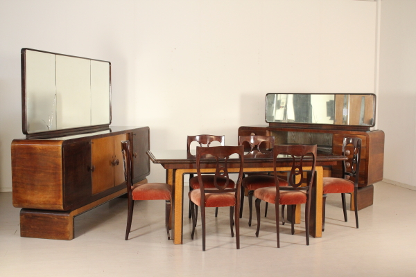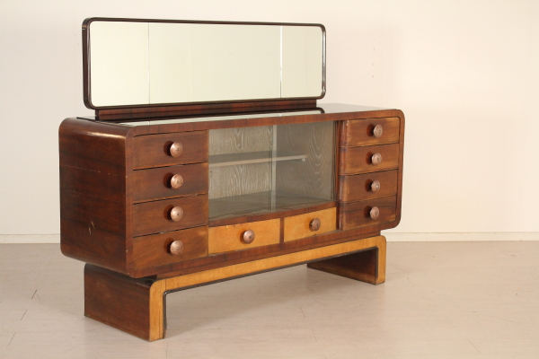 Mobile buffet con cassetti ed ante in vetro scorrevoli; specchio, legno impiallacciato mogano e radica, vetro retro verniciato. Buone condizioni, presenta piccoli segni di usura.
