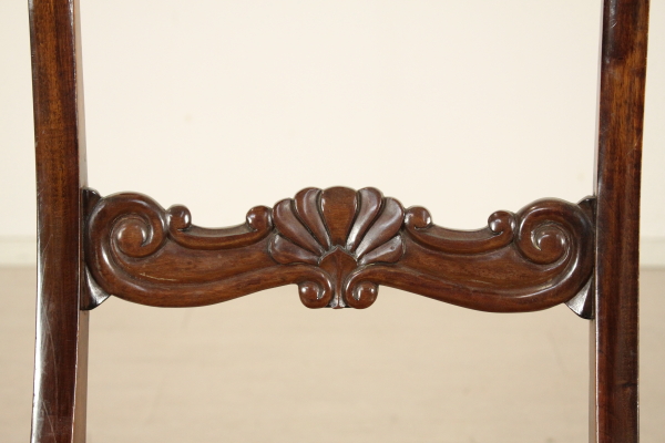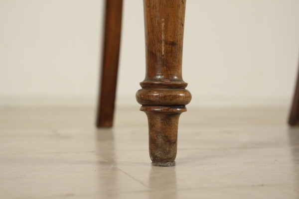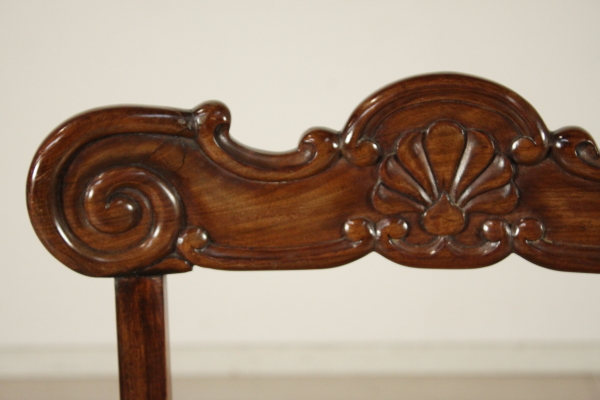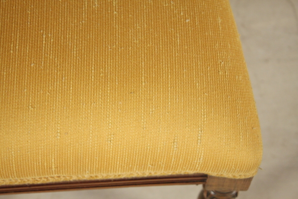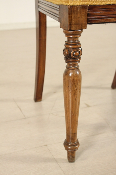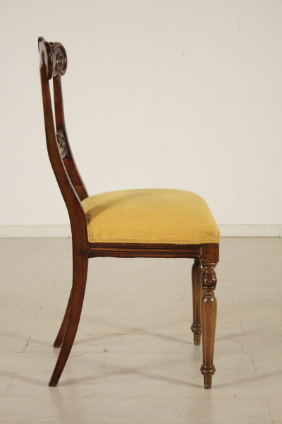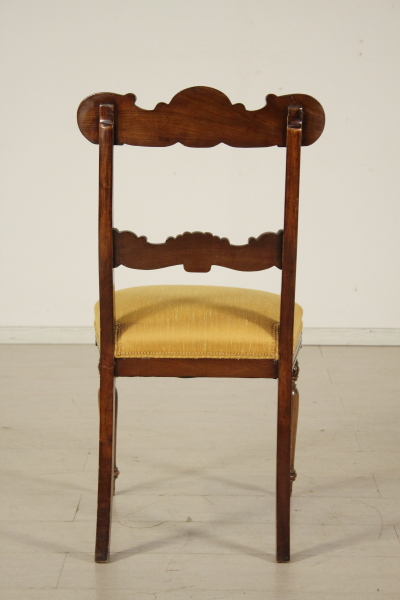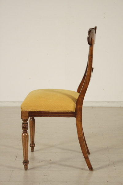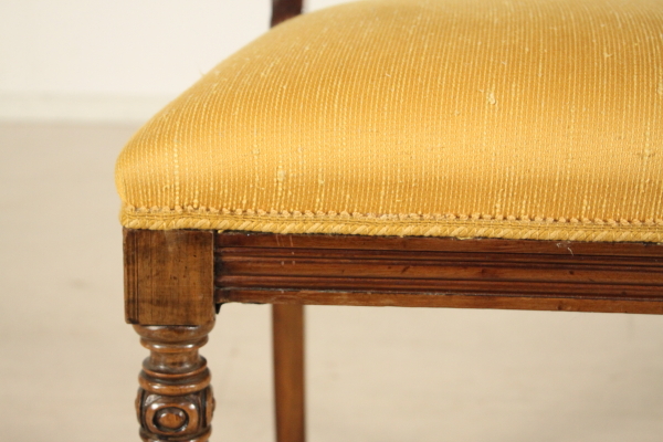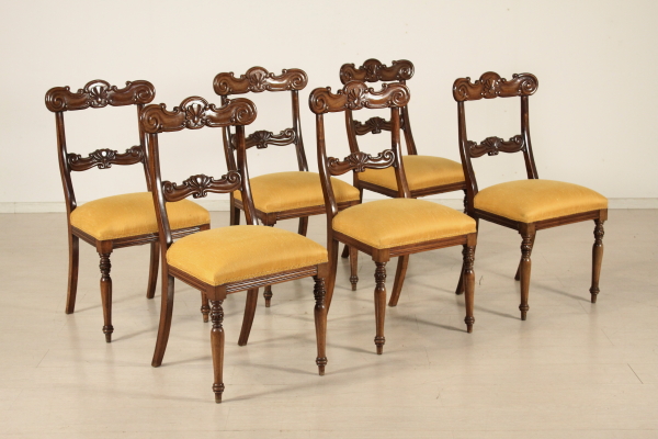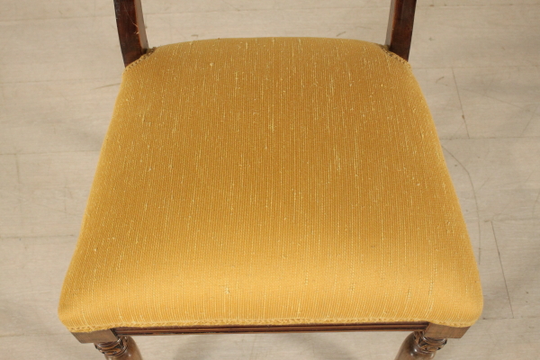 Gruppo 6 sedie. Gambe anteriori tornite presentano cartella intagliata. Seduta imbottita.