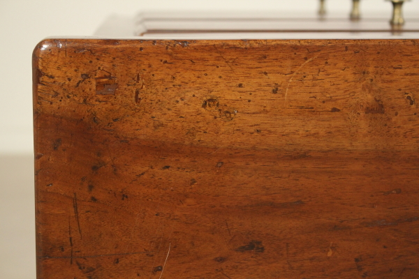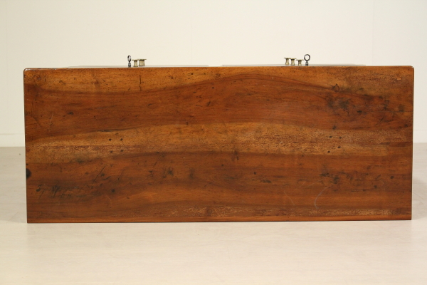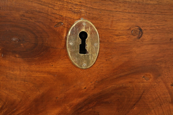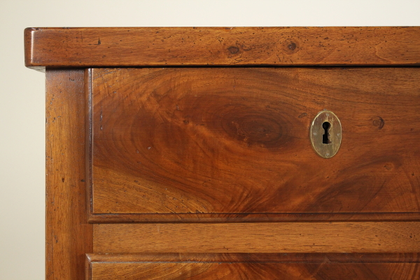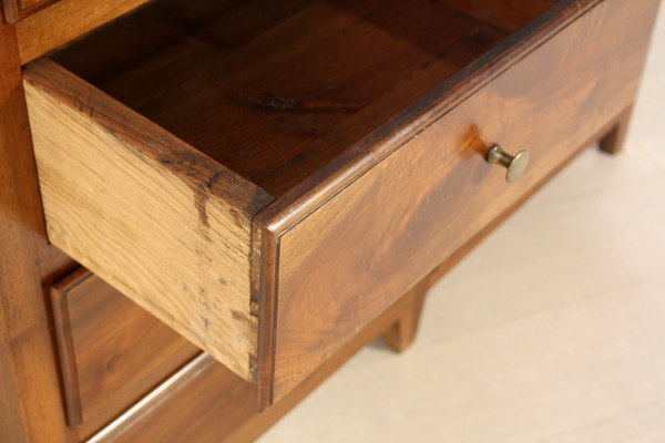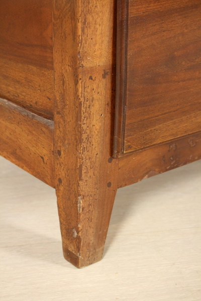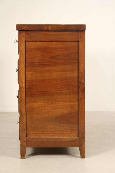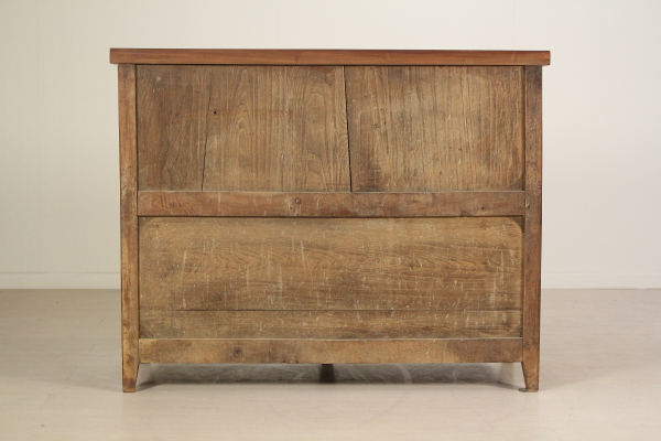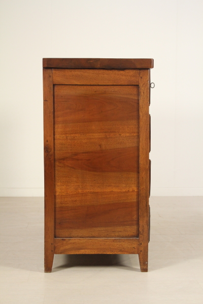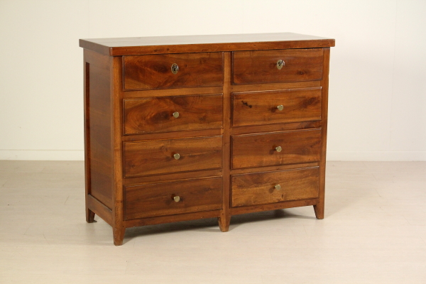 Comò otto cassetti. Presenta due file da quattro cassetti ciascuna. Retto da piedi tronco-piramidali, interni in castagno. Pomoli e piano non coevi.