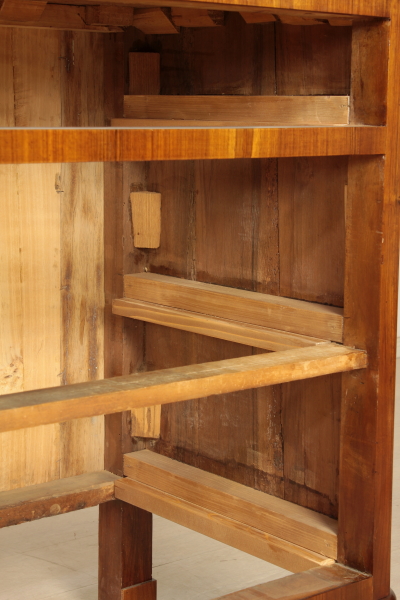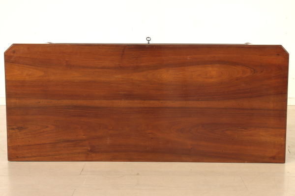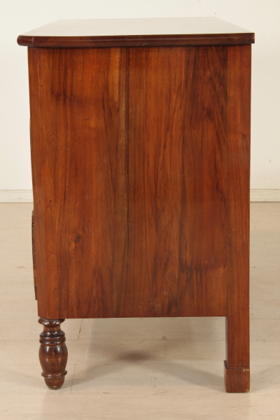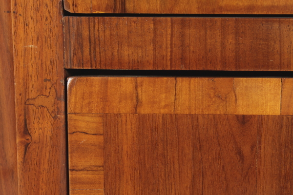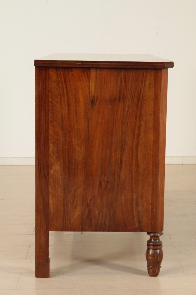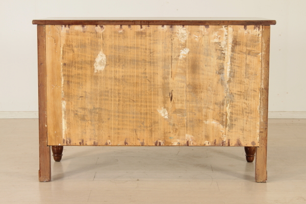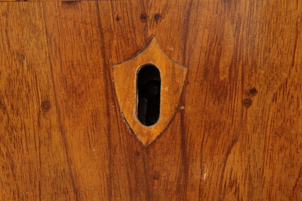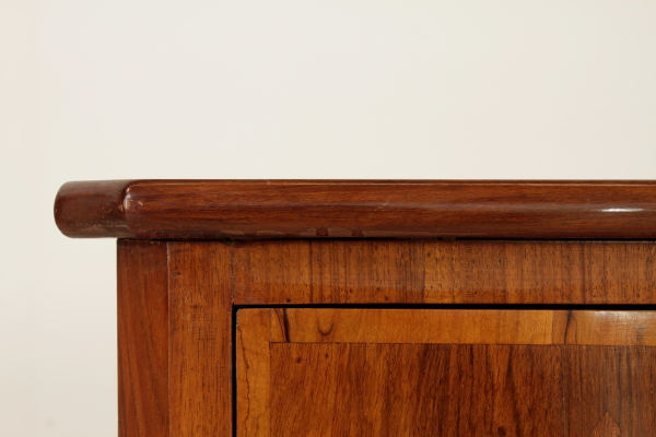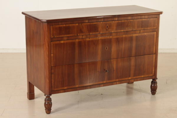 Comò Direttorio. Presenta coppia di cassetti senza catena e cassetto più piccolo sotto-piano. Cassetti bordati da lastronatura in ulivo. Piedi non coevi. La serratura dell'ultimo cassetto chiude entrambe.