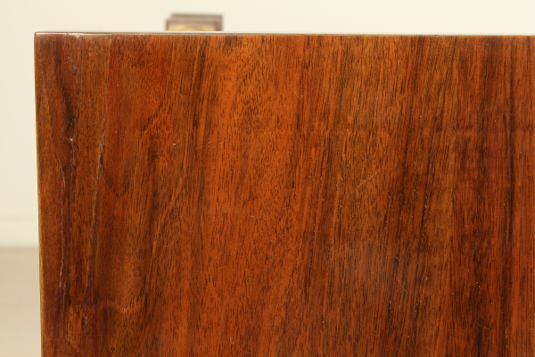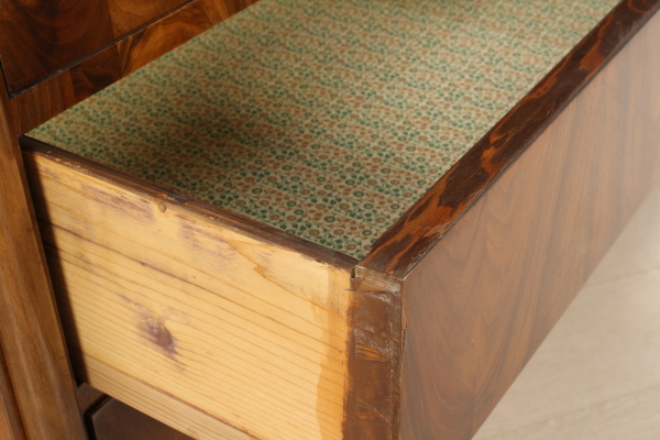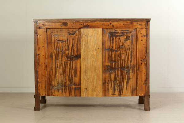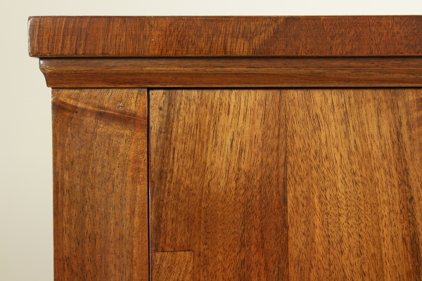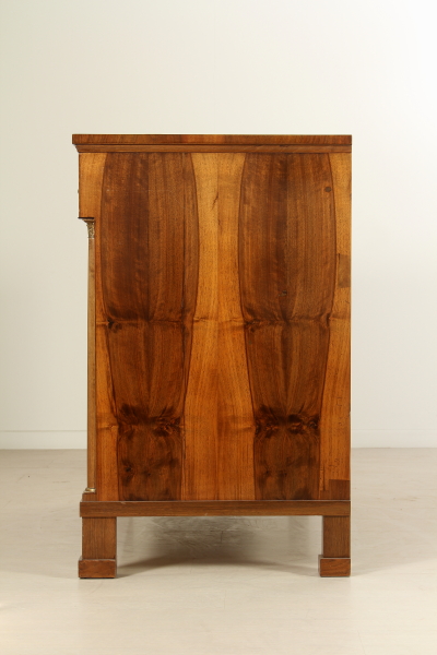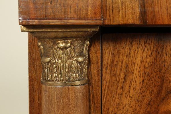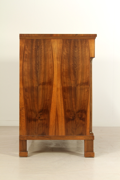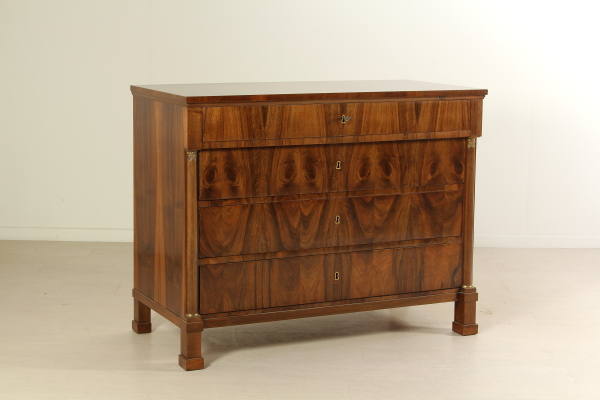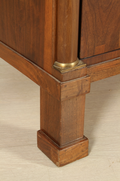 Comò impero. Presenta quattro cassetti di cui il primo leggermente aggettante. Montanti con mezze colonne con capitelli in bronzo terminanti con piedi a plinto. Fronte lastronato piuma di noce. Piano lastronato noce di traverso.