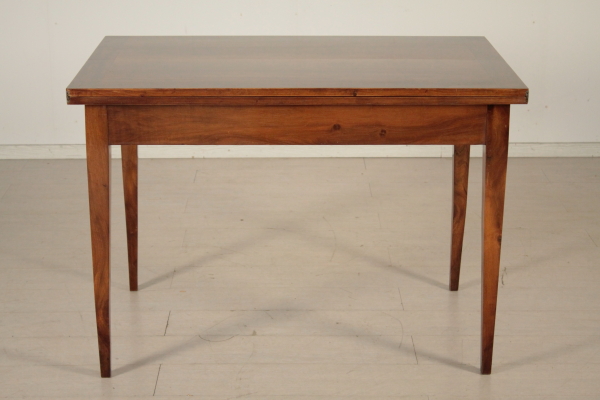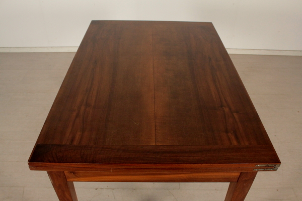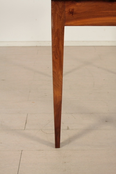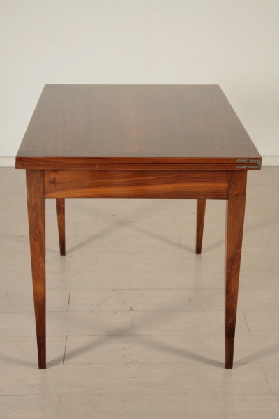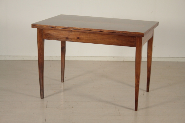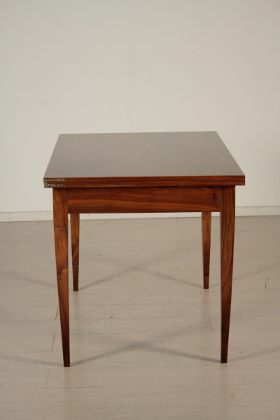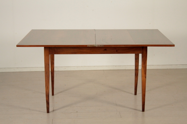Tavolo a libro. Retto da gambe tronco-piramidali presenta fasce lastronate noce. Piano apribile a libro. Vano sottopiano.