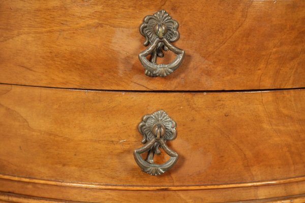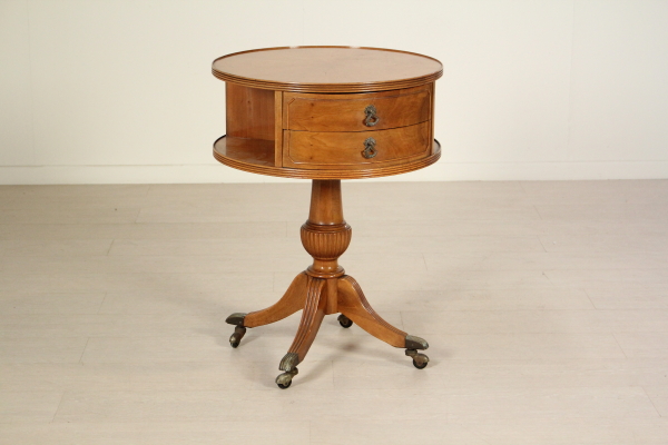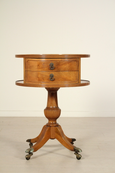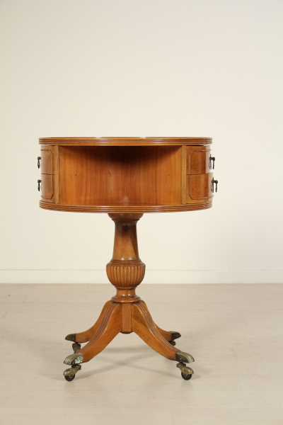 Tavolino tondo girevole. Retto da balaustro terminante con piedi mossi su rotelle presenta corpo tondo girevole con due coppie di cassetti e vani a giorno.