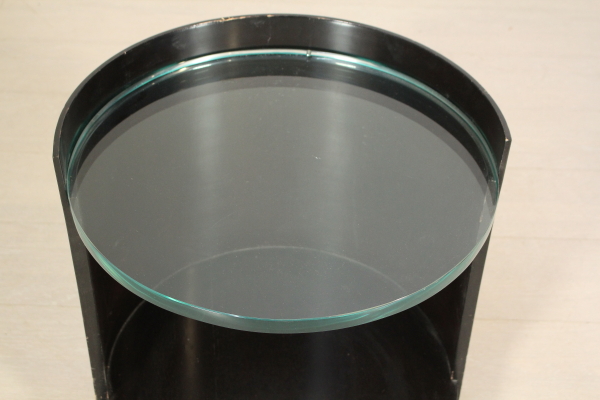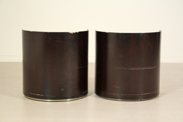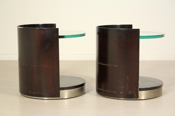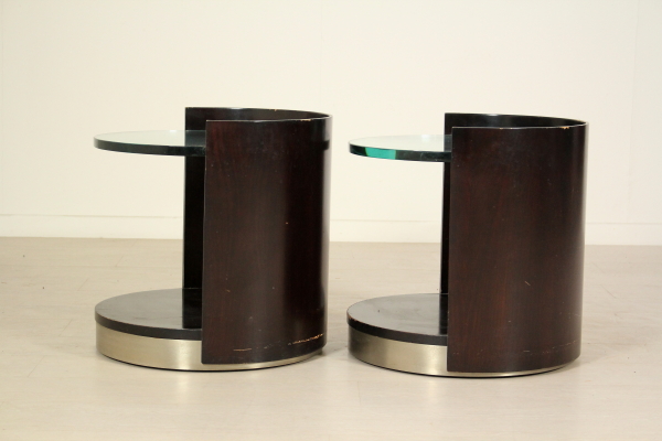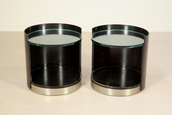 Comodini anni 70. Coppia di comodini in legno impiallacciato palissandro, lamina in metallo cromato, vetro. Discrete condizioni, presentano alcuni segni di usura.
