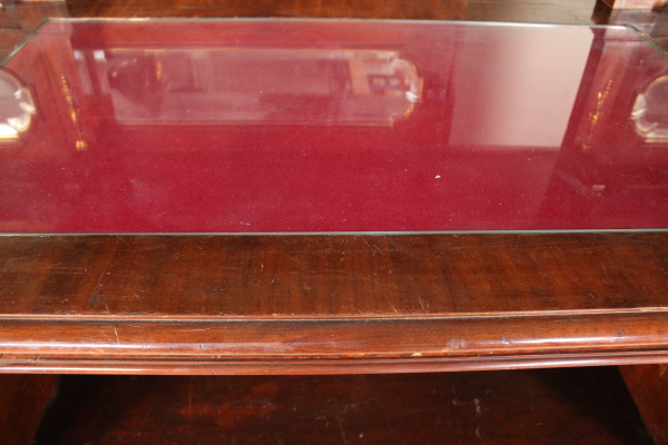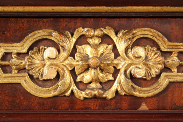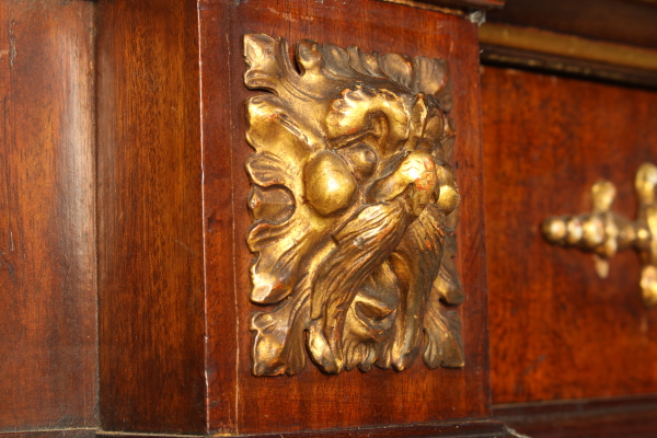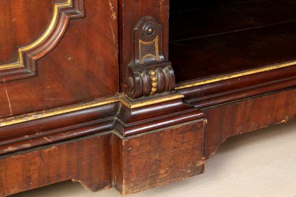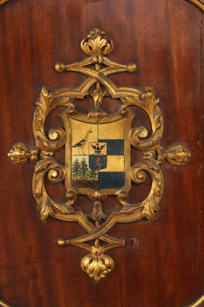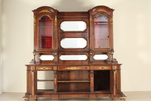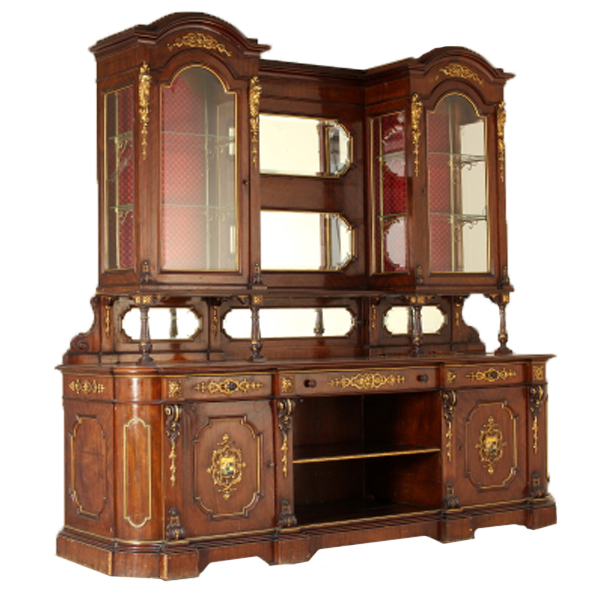 Grande credenza retta da zoccolatura, presenta coppia di ante con stemmi intagliati e decorati e vano a giorno centrale. Piano sagomato con vetri incassati. Alzata retta da colonne tornite e schienale con pannello scorrevole. Presenta coppia di ante sagomate con vetri bisellati. All'interno strutture reggiripiani in ottone. Cinque specchi sagomati e bisellati. Intagli e profili dorati.