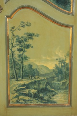 Retto da piedi a mensola presenta coppia di ante sagomate con capricci decorati. Pannelli laterali con decorazioni floreali. Cornici dorate e cimasa intagliata.