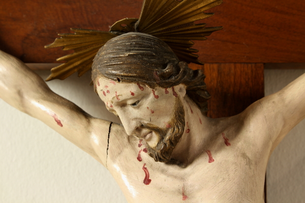 In legno scolpito e decorato in policromia ed oro; la testa è sormontata da aureola in metallo sbalzato e dorato. Montato su croce in noce di recente fabbricazione