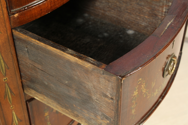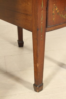 Scrivania a fagiolo da centro. Retta da gambe tronco-piramidali presenta due file da tre cassetti più uno centrale sotto-piano. Piano con riserva in mogano biondo e medaglione centrale dipinto. Arricchita da decorazioni floreali dipinte in policromia.