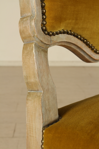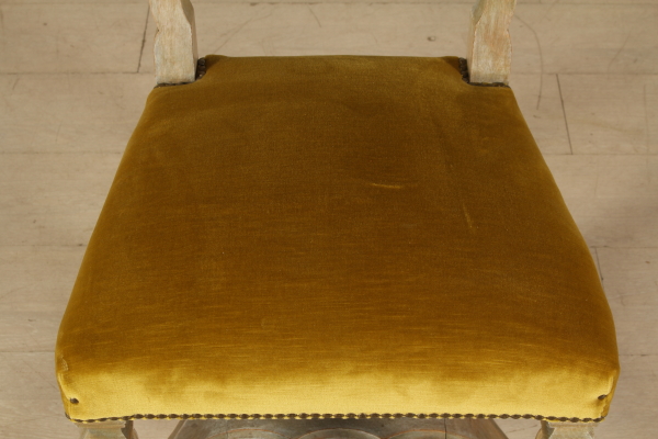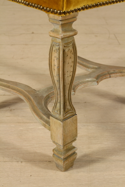 Rette da gambe intagliate e raccordate da crociera presentano schienale e seduta imbottita.