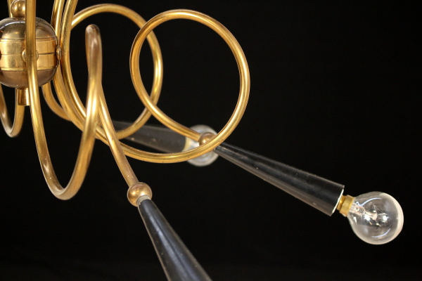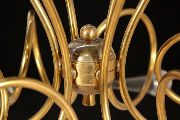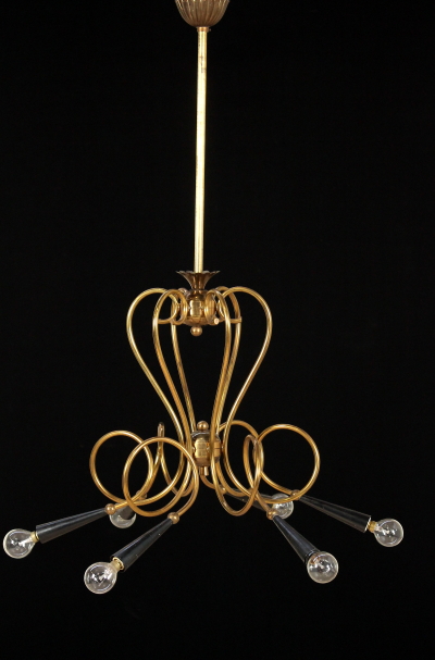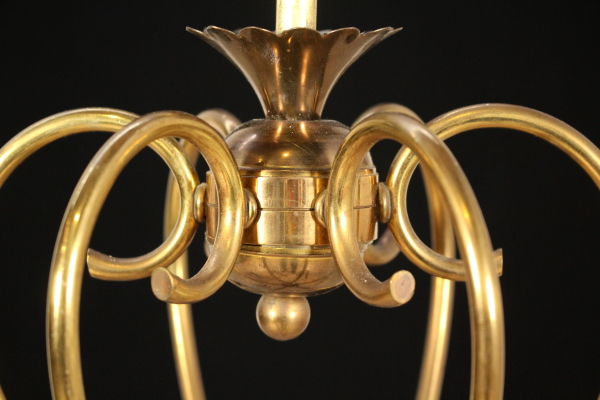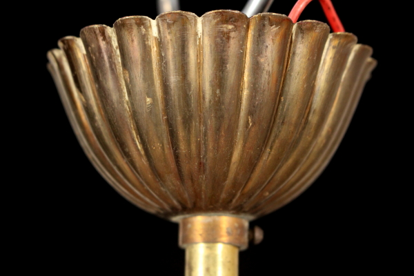 Lampada a sospensione; ottone, alluminio verniciato. Buone condizioni, presenta piccoli segni di usura. Non è stata revisionata.
